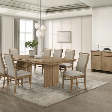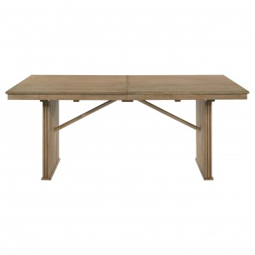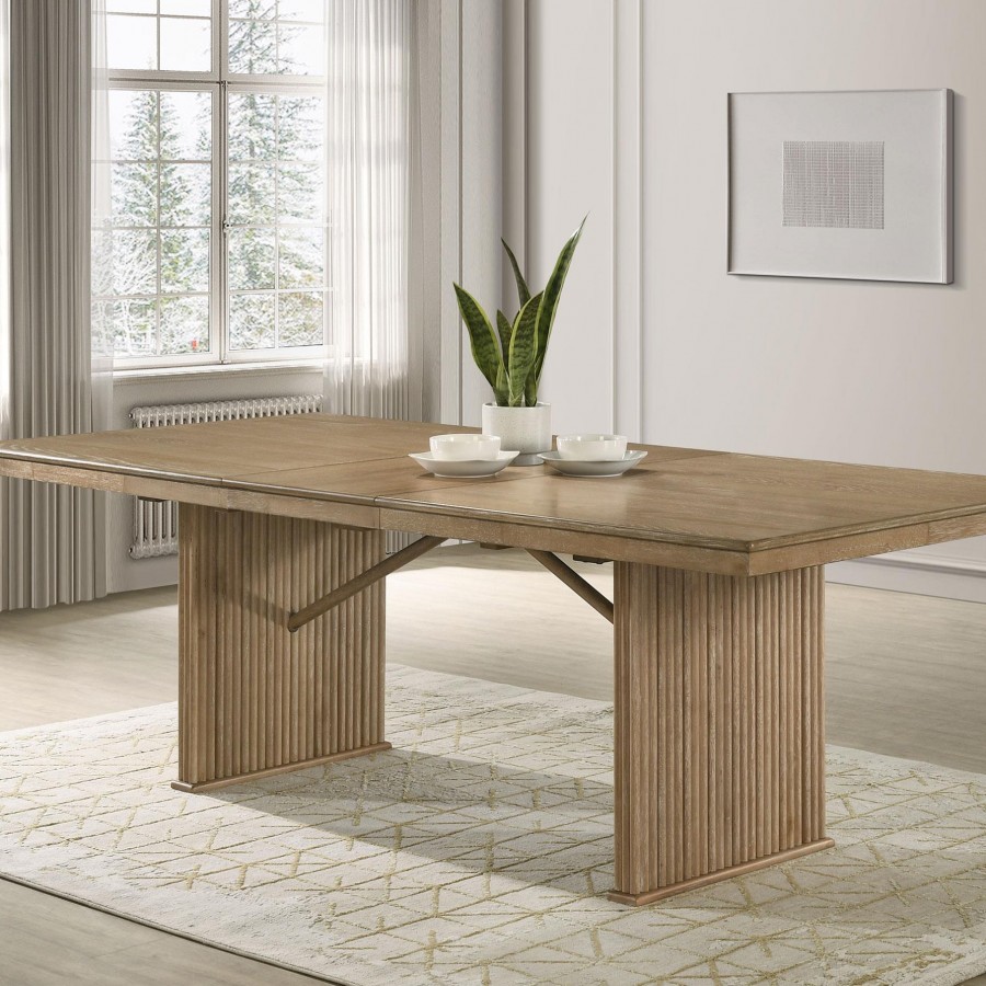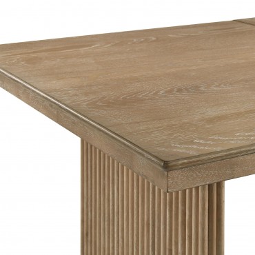 This dining table in a distressed light brown finish combines modern elegance with natural textures. Crafted from oak veneer, rubberwood, and engineered wood, the table boasts a sturdy and stylish design. The base features striking vertical reeding side panels that add a touch of texture and visual interest. Designed for both intimate meals and larger gatherings, the table includes an extension leaf for versatile seating. Its clean lines and unique base make it a perfect centerpiece for contemporary dining spaces.
