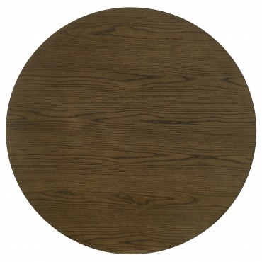 This transitional-style round dining table combines timeless design with practical functionality. Featuring a rich brown finish, it showcases a beautifully crafted tabletop supported by angular legs for a contemporary touch. An open lower shelf adds convenient storage or display space, enhancing its versatility. Constructed from white oak veneer, rubberwood, and engineered wood, this table provides both durability and style, making it a perfect centerpiece for any dining space.
