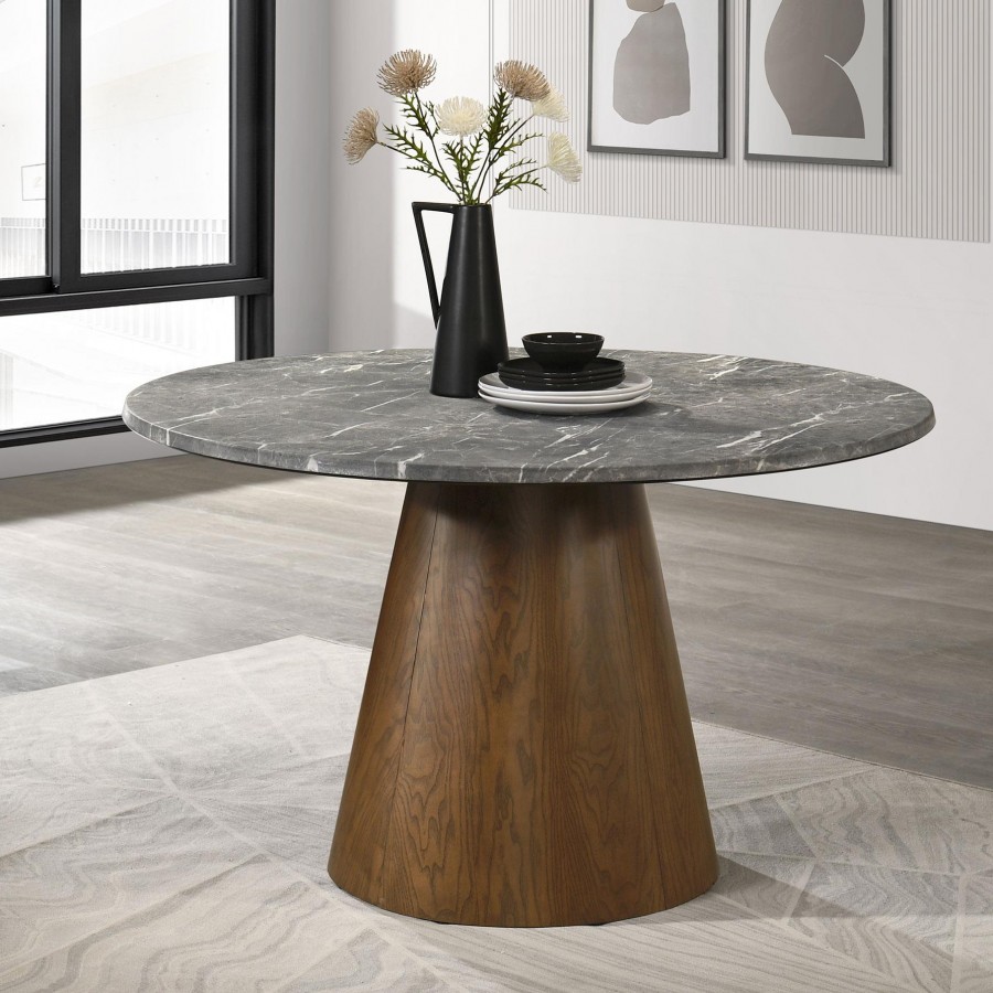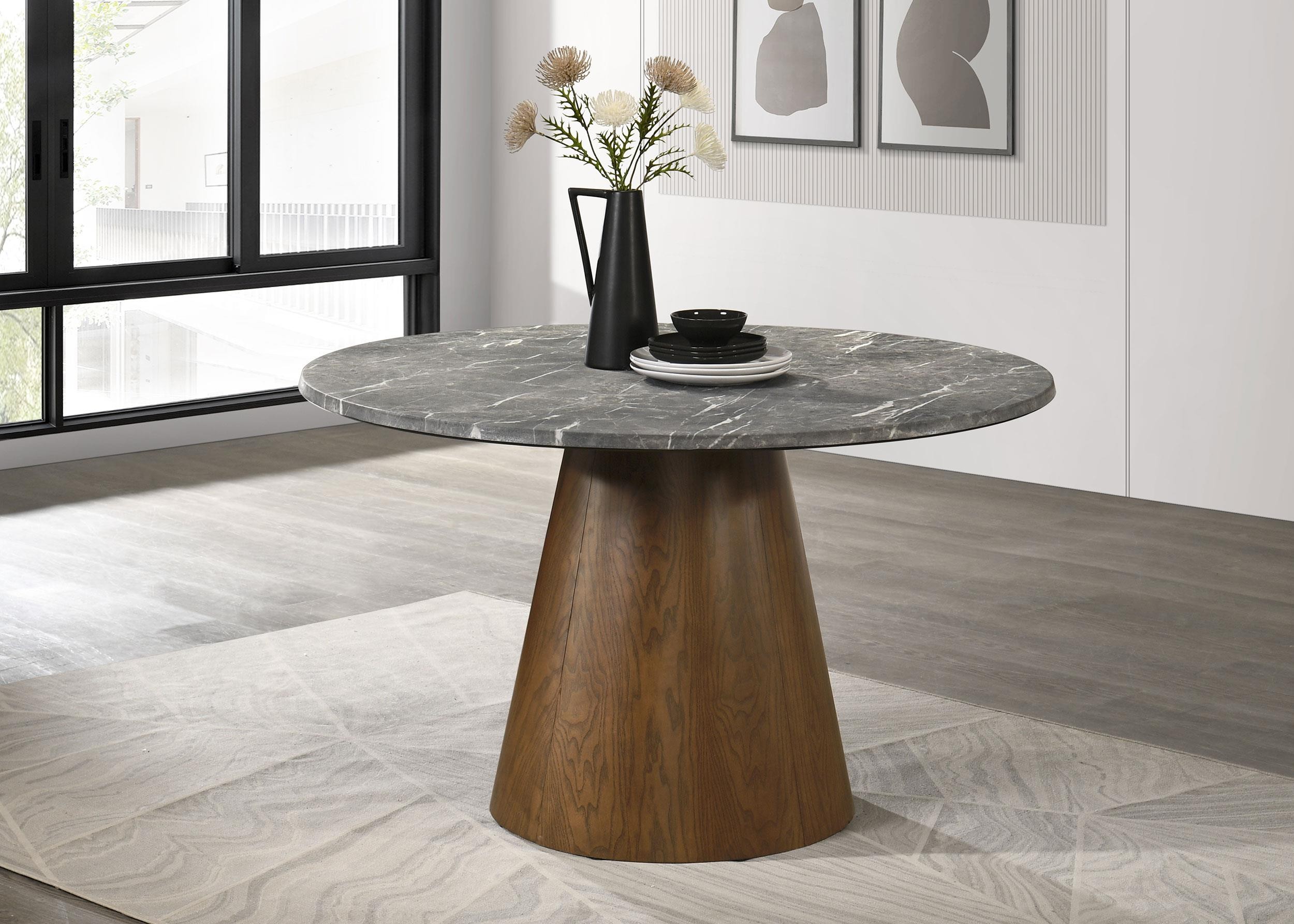 This round dining table blends sculptural minimalism with cutting-edge durability for a bold yet refined statement. Its Smart Top surface features a revolutionary faux marble laminate that is environmentally friendly, heat resistant, break-proof, stain and scratch resistant, and effortless to maintain. The veined grey top rests on an inverted conical pedestal in a rich dark brown finish, crafted from four interlocking panels with tension lever table lock for seamless assembly. Ideal for seating four to six, it elevates any modern dining room.