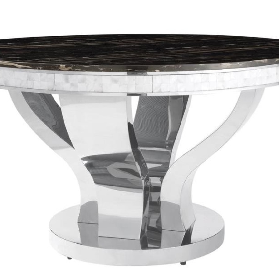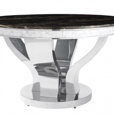 This uniquely-designed dining table has a solid appeal that's sure to please. It has a large round top with a handsome marble-like design. The table edge is fashioned in contrasting burnished silver. The curved silver legs are wide for a strong, distinctive stance atop a solid silver base. Pull up a set of well-appointed chairs and make this a complete dining set for any dining space.