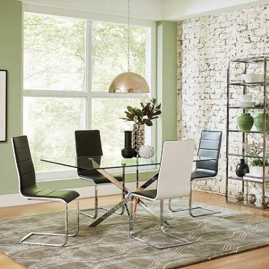 This rectangular dining table delivers sculptural impact with a crisp modern profile. Its clear tempered glass top offers a clean, durable surface that visually opens the space. Below, a striking asterisk-shaped base crafted from heavy gauge metal adds architectural flair, finished in electroplated chrome for a polished, reflective effect. A bold blend of minimalism and design-forward structure, this table anchors any contemporary dining area.