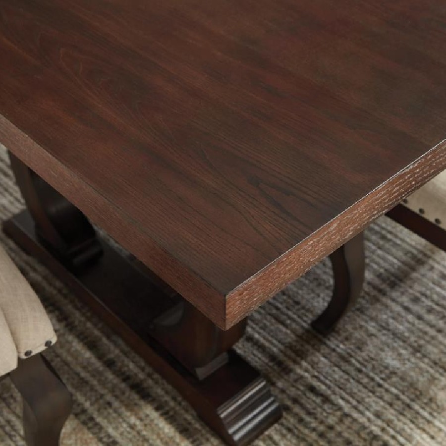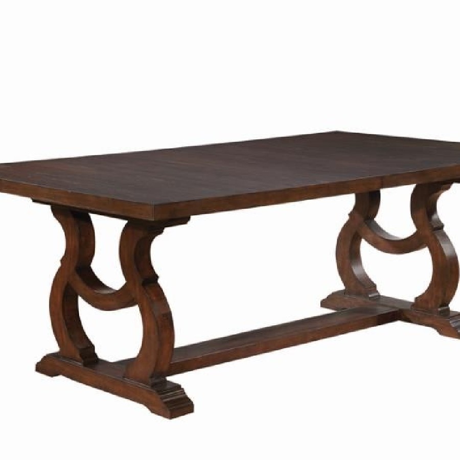A decorative base is the highlight of this stylish transitional wood dining table. Featuring a rectangular silhouette measuring just over 104 inches, the table easily accommodates eight for everything from a quick breakfast to a holiday feast. Intriguing curves draw the eye, demanding attention without overwhelming surrounding decor. A dark and rich antique java finish ensures an elegant presence in any decor. Choose coordinating Brockway collection chairs (sold separately) for a pulled-together, refined aesthetic.