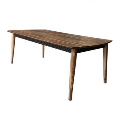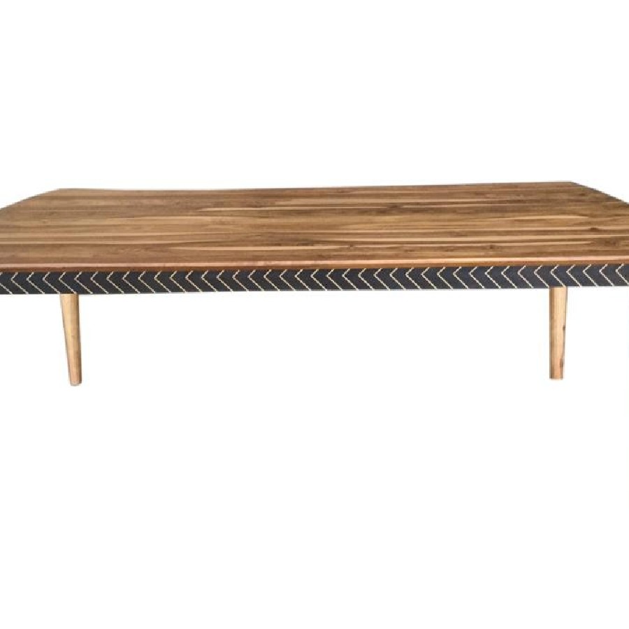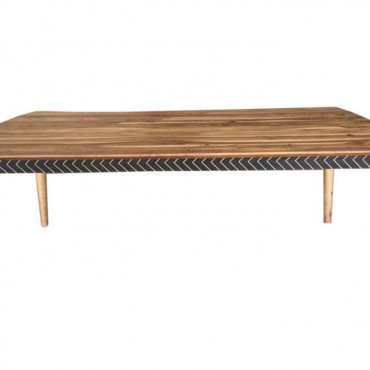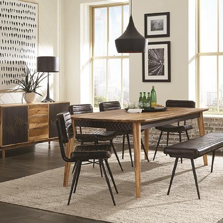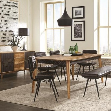 With a retro flair and minimal silhouette, this dining table makes a lovely furniture piece to a modern farmhouse style home. Made of solid sheesham wood and hand crafted, the table features a warm natural finish that complements many color palettes and lends an earthy vibe. Surrounding the table just below the top is an apron with a black chevron pattern design that brings an art deco touch and contrast. Four straight, tapered legs offer an elegant quality. Also available in this Partridge collection is a matching chair, bench, and dining server to complete an entire dining room ensemble.