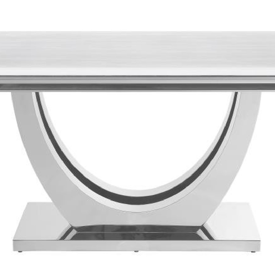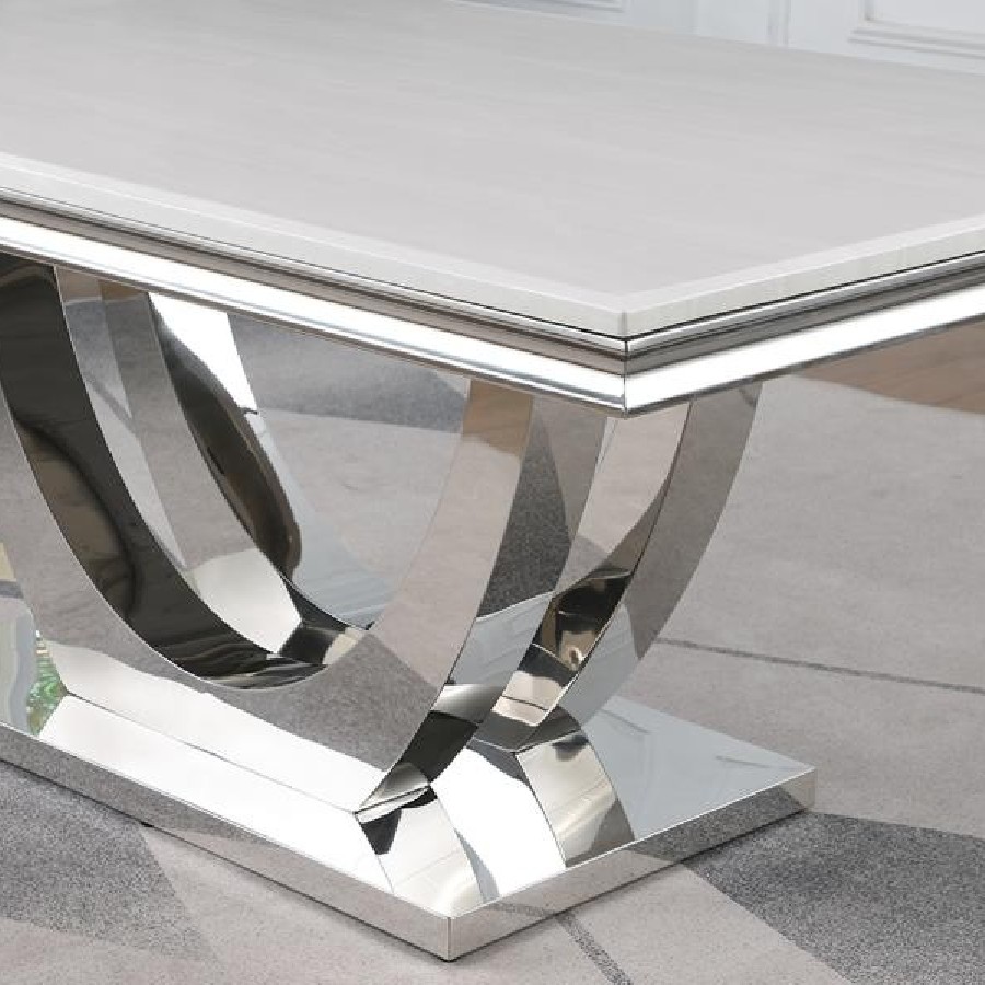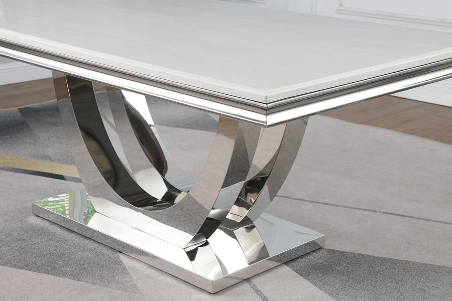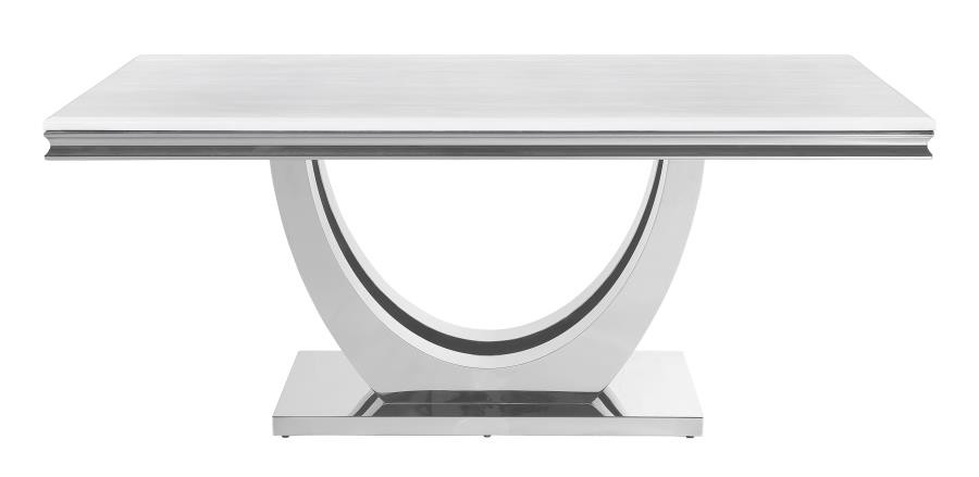 Host family and friends around this sleek, modern glam dining table for an elevated dining experience. Designed with an open demilune pedestal base in a lustrous polished chrome finish, this magnificent, rectangular dining table lends a luxurious look and feel to your space. A spacious tabletop is covered in a white marble paper and features a beveled edge that offers a timeless contemporary touch. The open pedestal base rests on a slim flush base that offers extra stability and a seamless expression. Seat six guests comfortably at this sophisticated dining table.