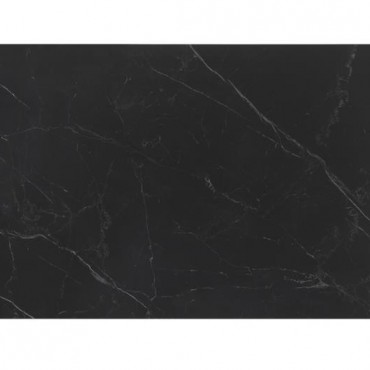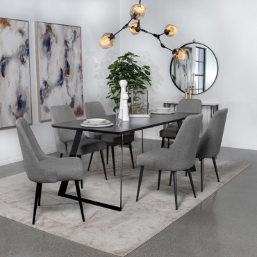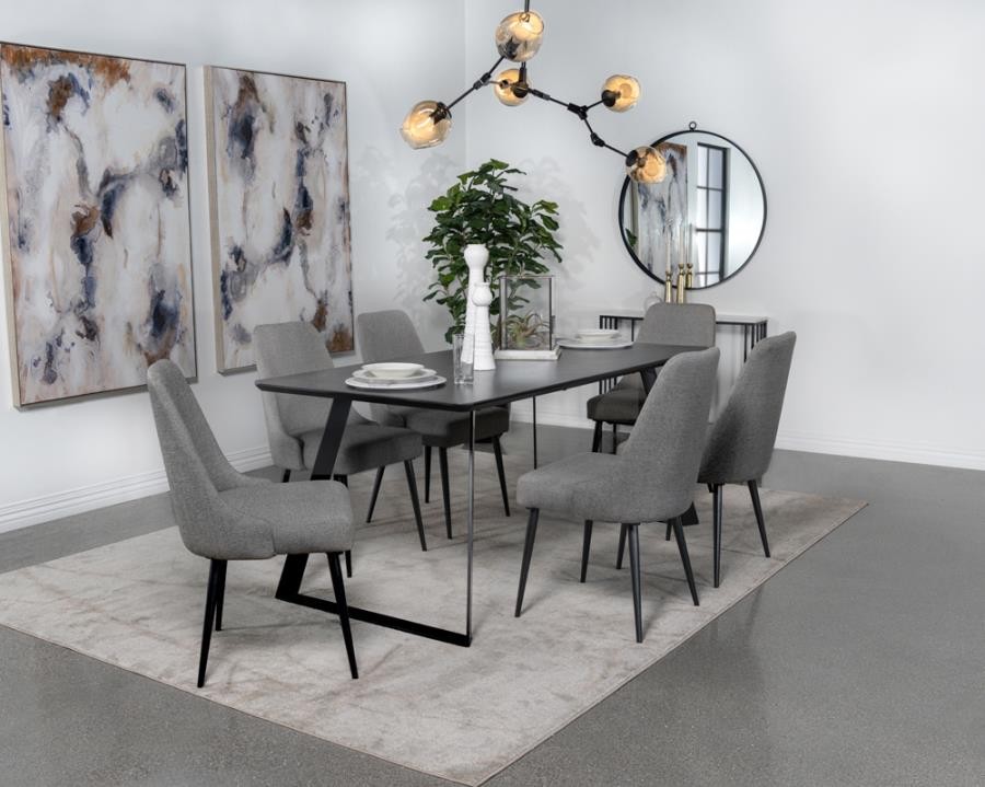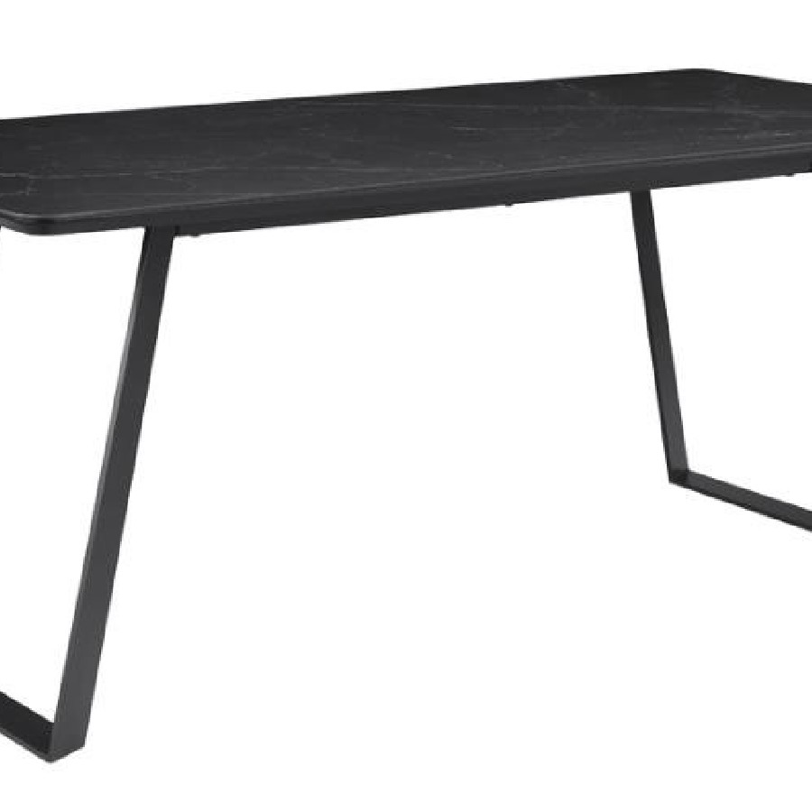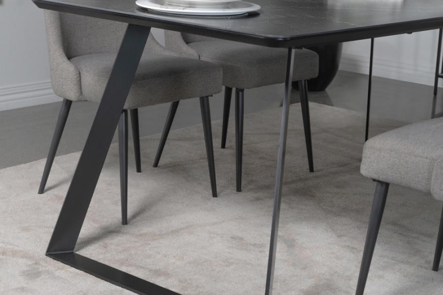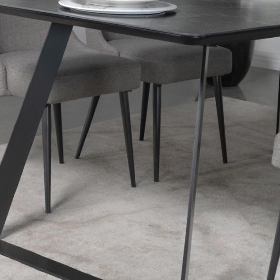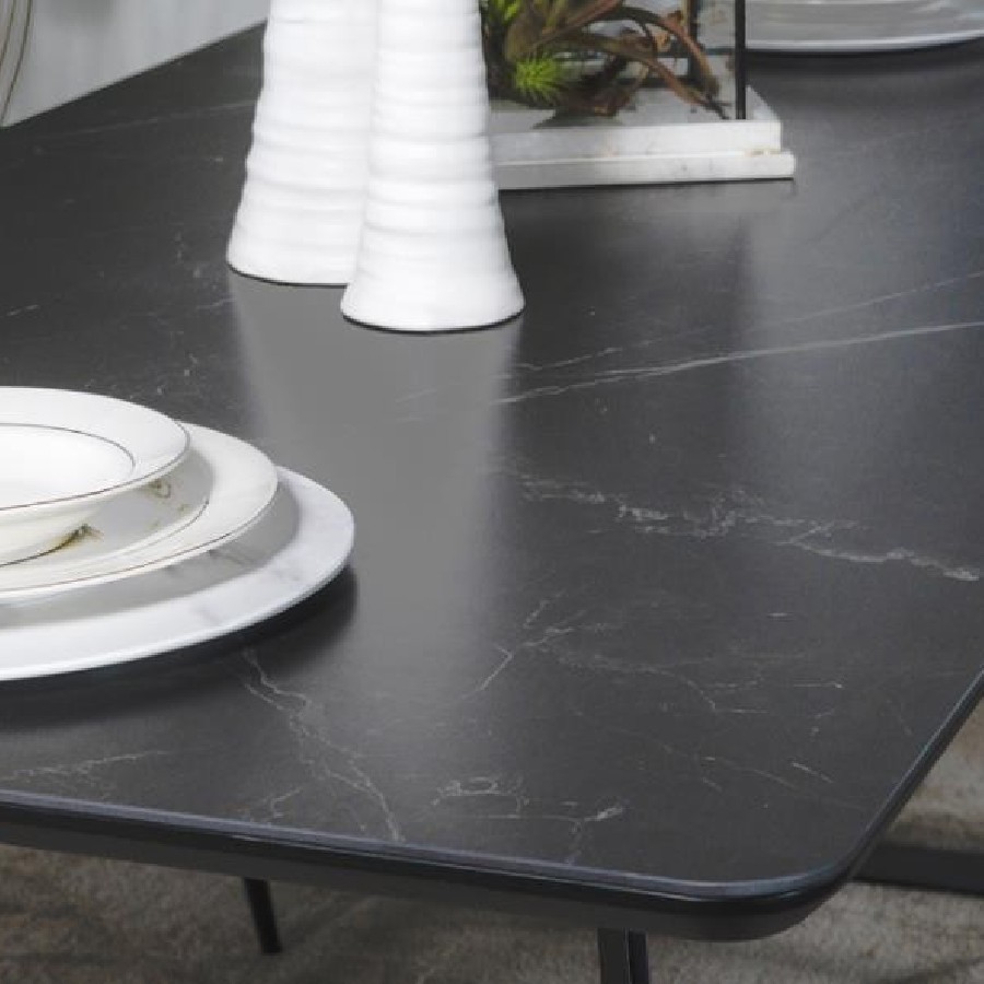 Transform your dining room into a sleek interior with this modern dining table. A bold, matte gunmetal finish defines the hard edges and clean lines of this stellar mid-century modern-inspired dining table. A spacious rectangular top with a rounded bevel edge presents ample seating for six guests. Sled style legs flare outward, creating a dramatic expression. A black China ceramic tabletop with softly rounded corners features an elegant white striation throughout for a classically designed marble-like appearance.