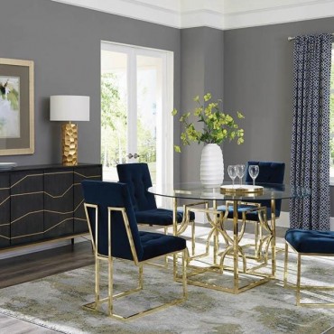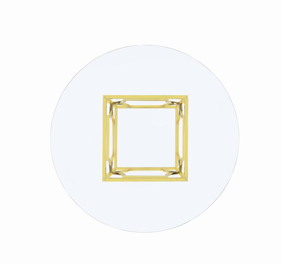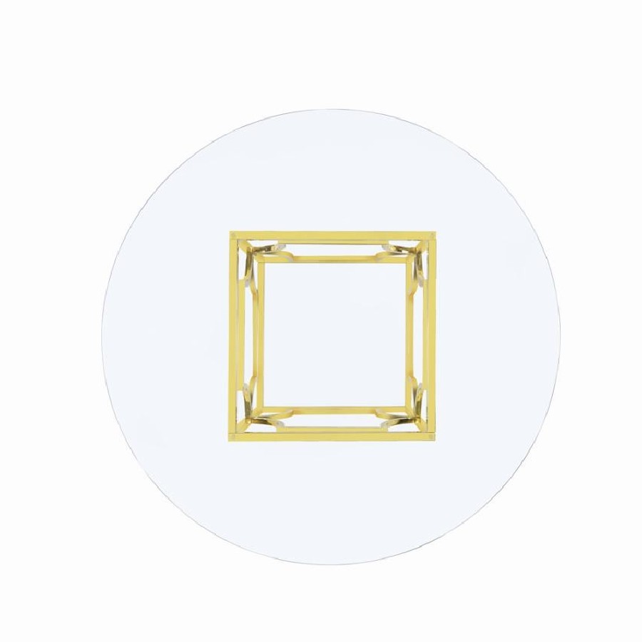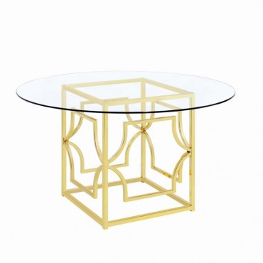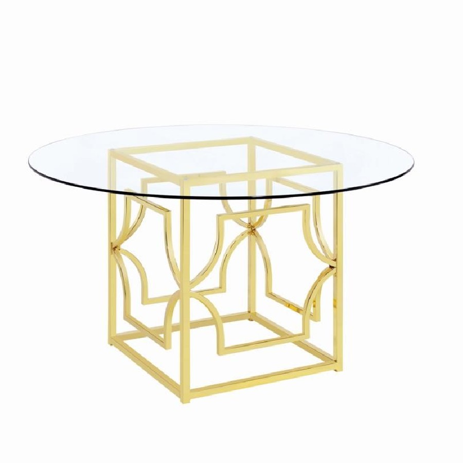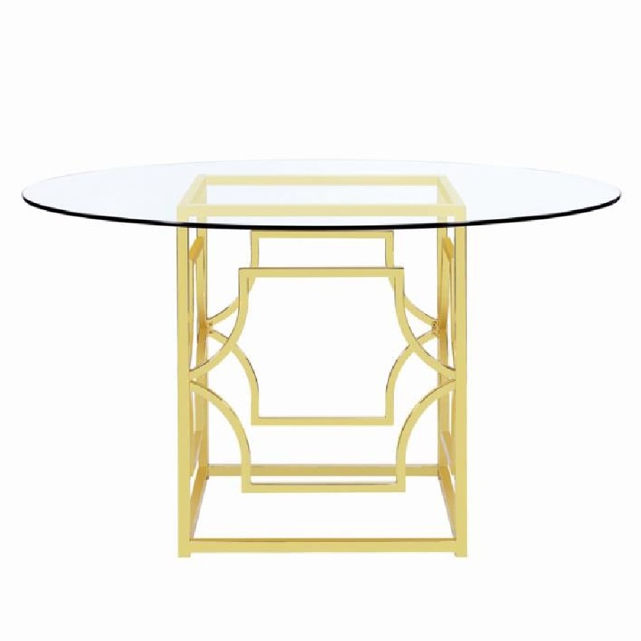 Sculptural and versatile, this round dining table base makes a bold design statement. The geometric metal frame showcases interlocking curved motifs within a square form, finished in a reflective electroplated surface. Designed to support a glass top of your choosing, it blends architectural flair and modern polish while offering flexible styling for custom dining configurations.