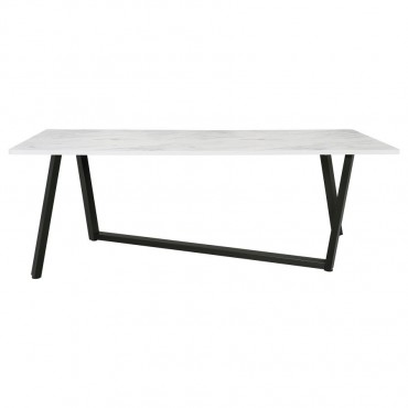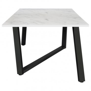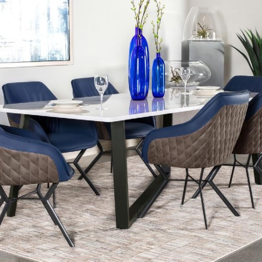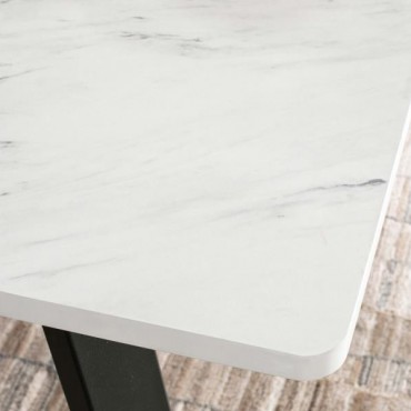 Strikingly modern with a classic twist, this dining table features a spacious faux marble top and an asymmetrical gunmetal metal base. The clean white surface offers the elegant look of marble with easy-care convenience, while the bold leg design brings architectural flair. Built for up to six guests, this table makes a dramatic statement in contemporary dining rooms or open-concept layouts.
