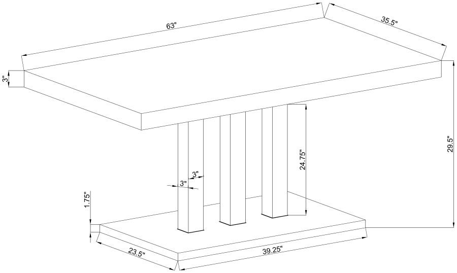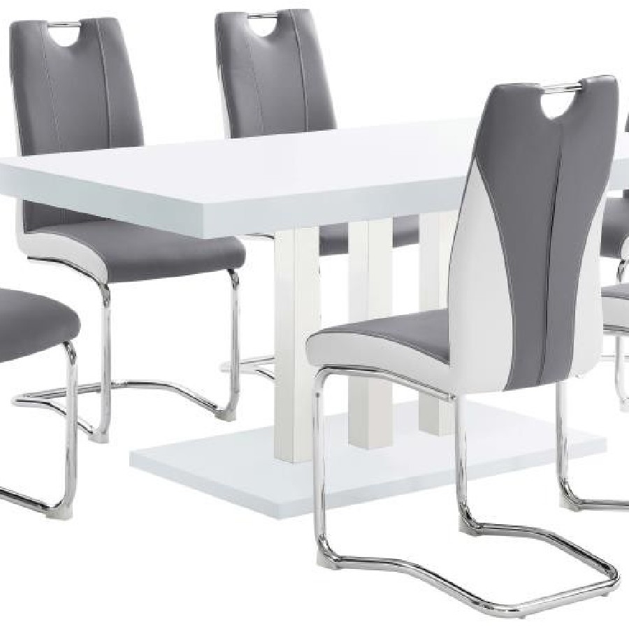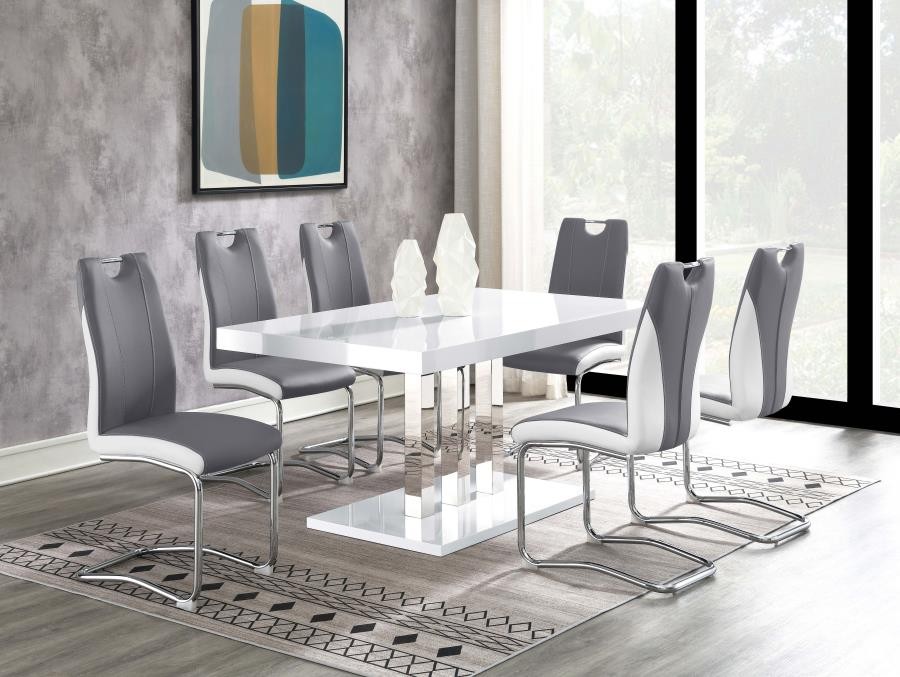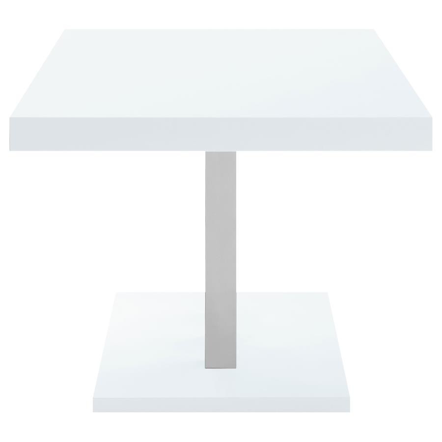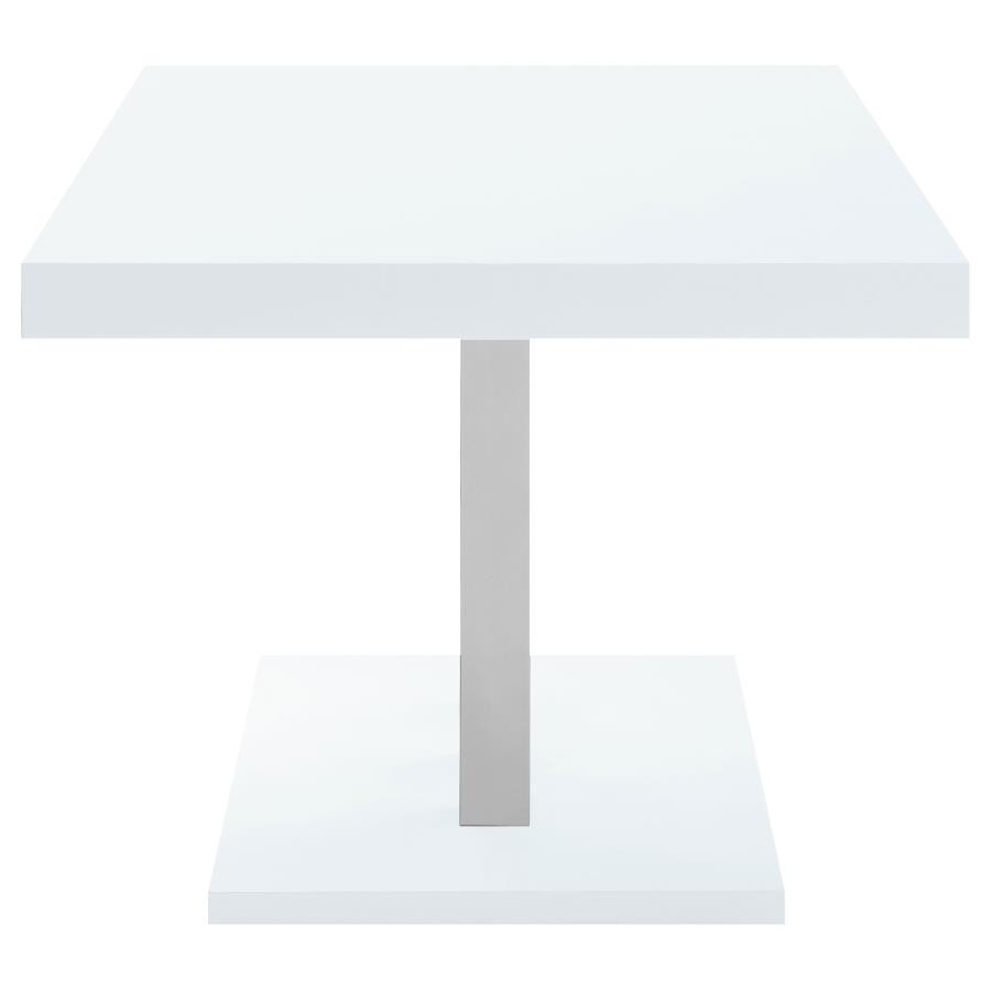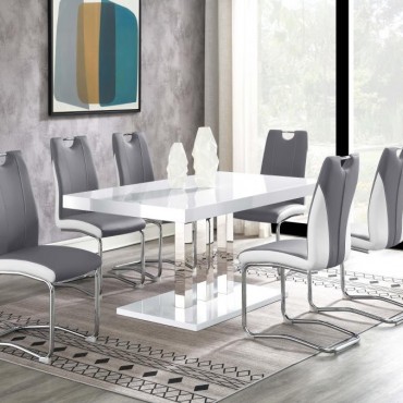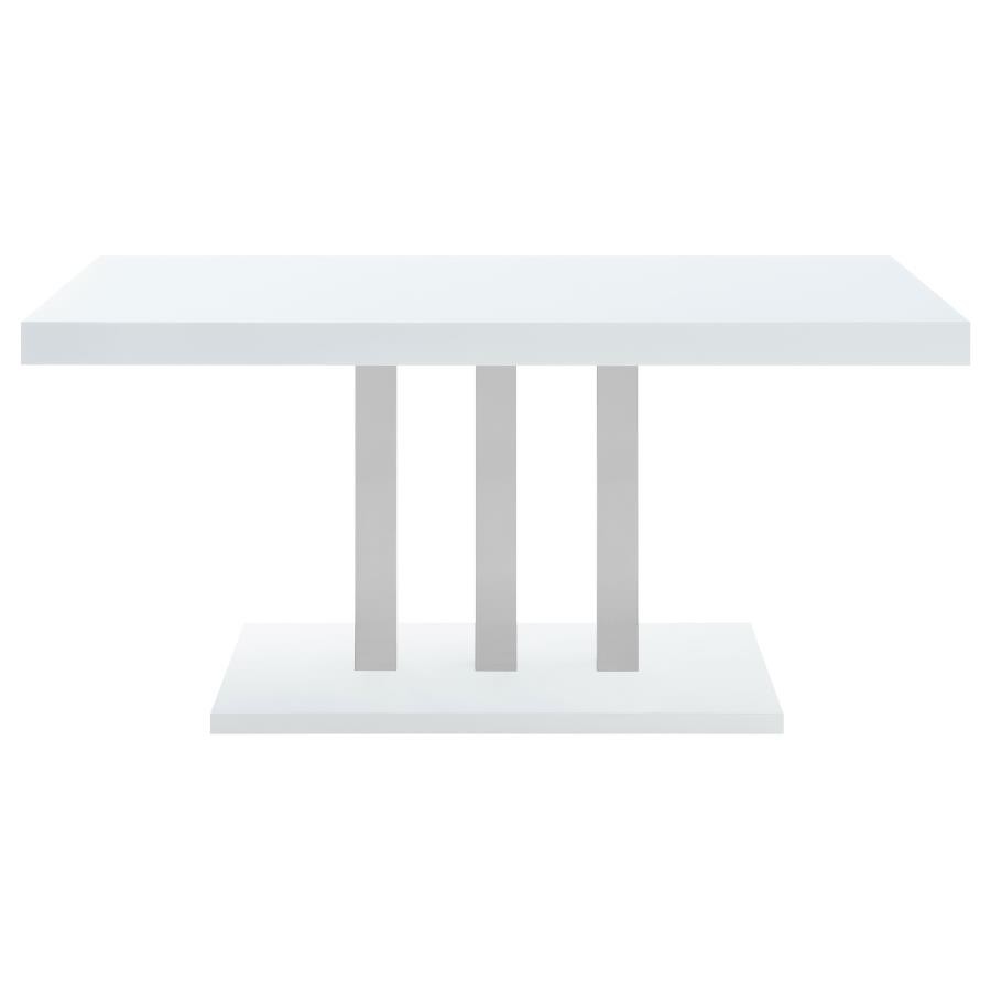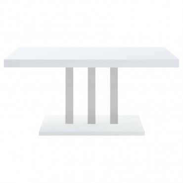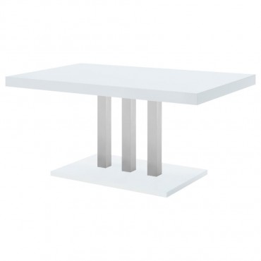 Sleek lines and smooth materials come together to create this ultra-modern dining table. Designed with a spacious rectangular top in a white high gloss finish that lends a polished, formal flair, this dining table offers up a chic style to formal entertaining spaces. Mirroring the top is a flush base, offering extra support and stability. With a pedestal-like design, the top and base come together with a trio of polished stainless steel supports in a lustrous and gleaming chrome finish. Place this dining table in a dining area for a jaw-dropping look.