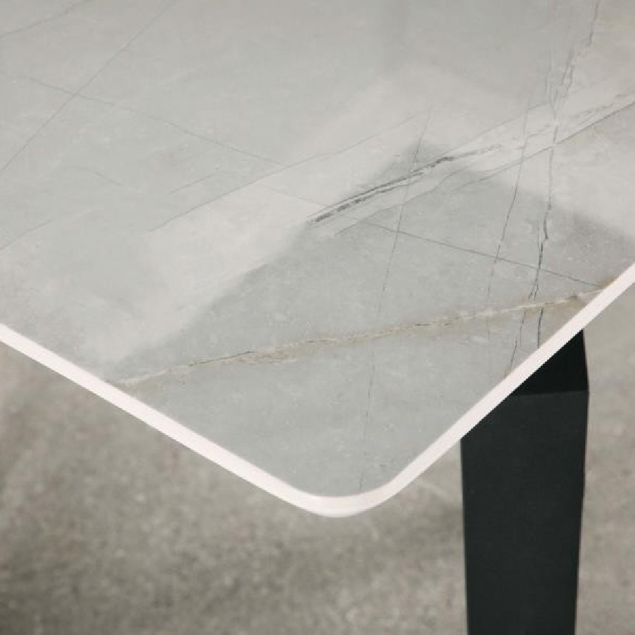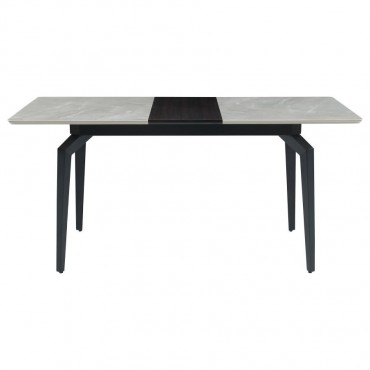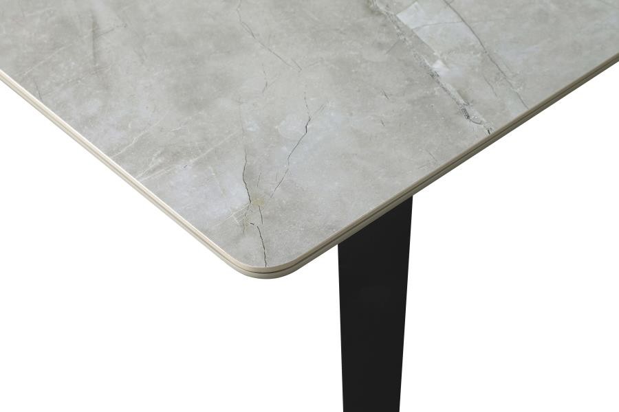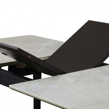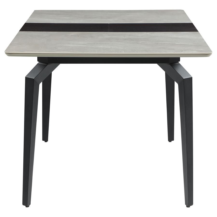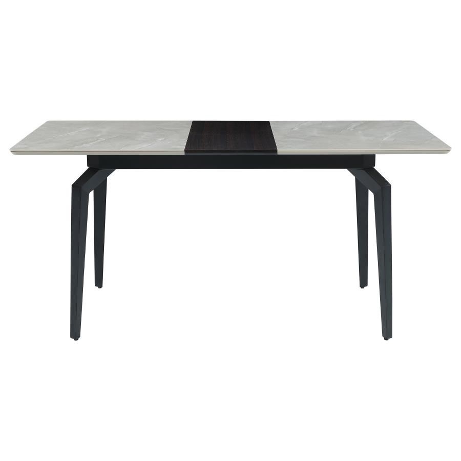 Sleek lines and sharp angles come together to create this elegant modern dining table. Designed with a gray ceramic tabletop designed to resemble marble, this dining table offers a strong and stable surface for entertaining guests. A self-storing butterfly leaf mounted on smooth metal glides lends additional space for extra guests too. Beveled edges and rounded corners soften the look of the stark lines of contrasting finishes. Long legs in a sandy black finish jut out from the top, offering a striking visual interest.