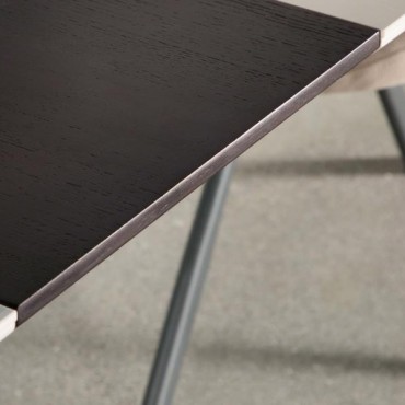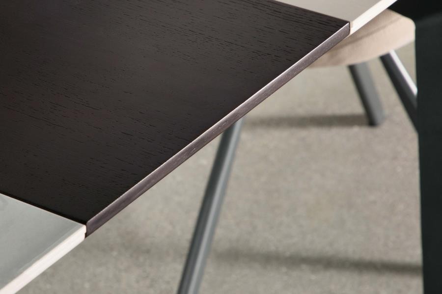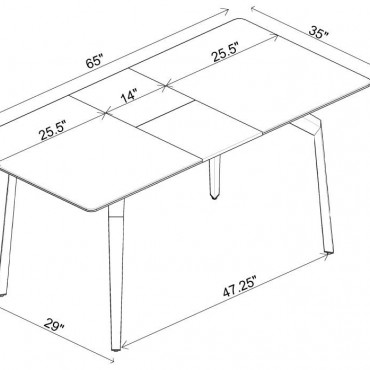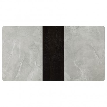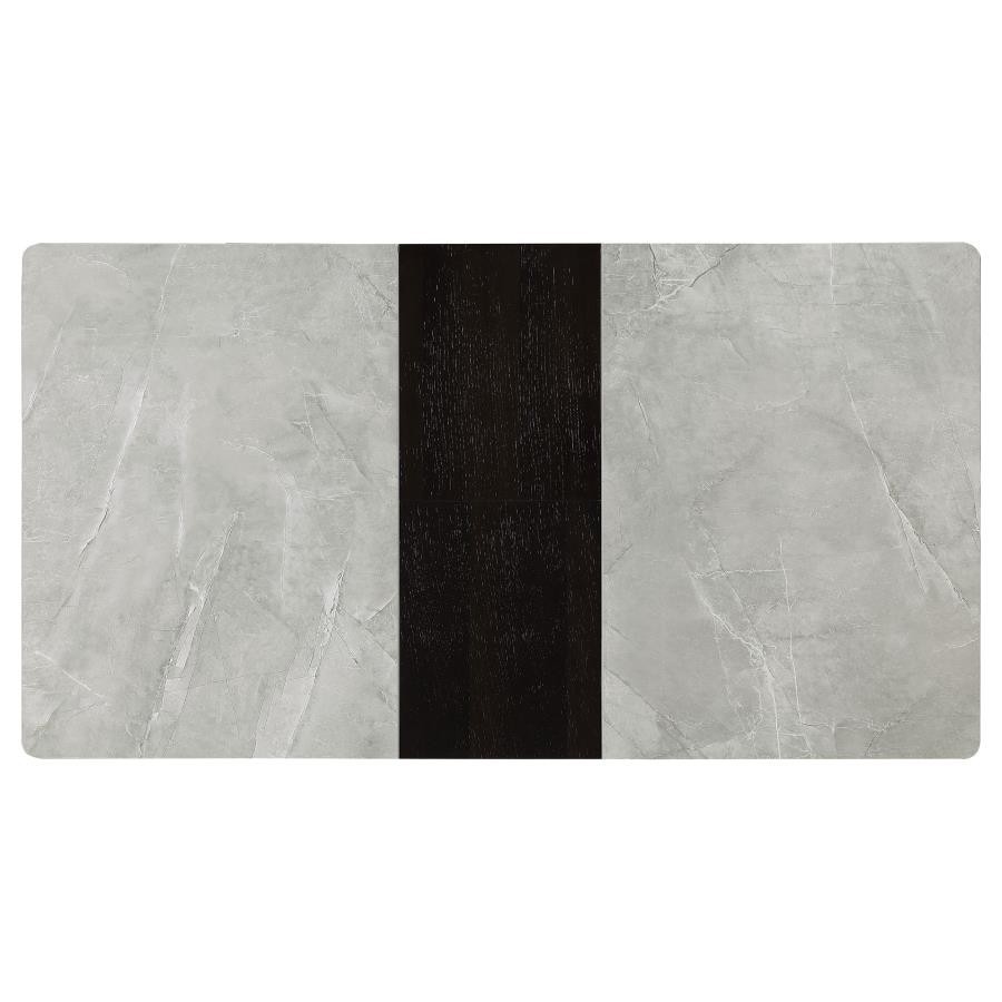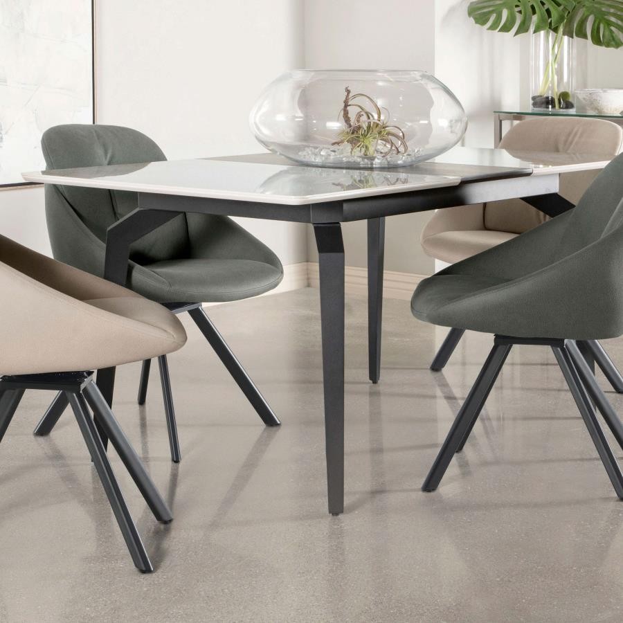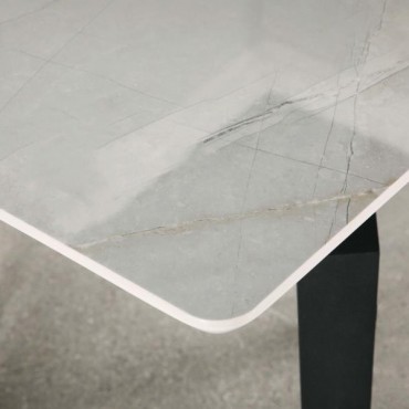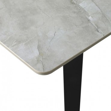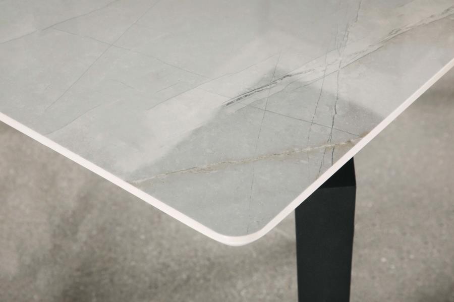 Sleek lines and sharp angles come together to create this elegant modern dining table. Designed with a gray ceramic tabletop designed to resemble marble, this dining table offers a strong and stable surface for entertaining guests. A self-storing butterfly leaf mounted on smooth metal glides lends additional space for extra guests too. Beveled edges and rounded corners soften the look of the stark lines of contrasting finishes. Long legs in a sandy black finish jut out from the top, offering a striking visual interest.