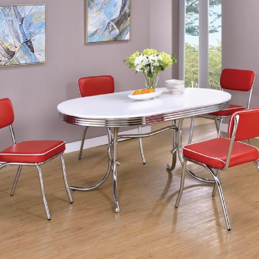 Bring vintage charm into your dining space with this retro-style oval dining table. Featuring a smooth white top with a chrome-rimmed edge, it channels classic mid-century diner vibes. The curvaceous chrome metal legs add stylish stability, while the easy-to-clean surface ensures practical everyday use. Perfect for creating a nostalgic, fun atmosphere in kitchens or casual dining areas.