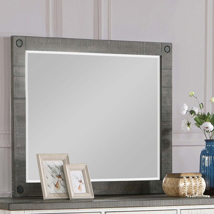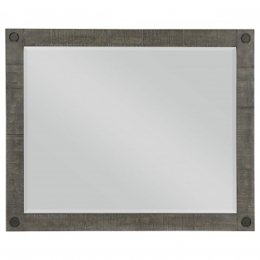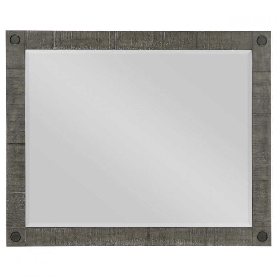 Top off a stylish Lilith collection bedroom set with the bright reflectivity of a framed mirror. Perfect for the dresser top, it sports a matching distressed gray finish over roughhewn wood details in pine wood and veneer. Each corner of the frame is complete with a single hexagonal bolt head, offering that perfect touch of rugged, industrial-inspired energy. The mirror glass is beveled to create a touch of depth within your bedroom. Use the mirror for morning rituals, or for quick 'fit check on your way out the door.