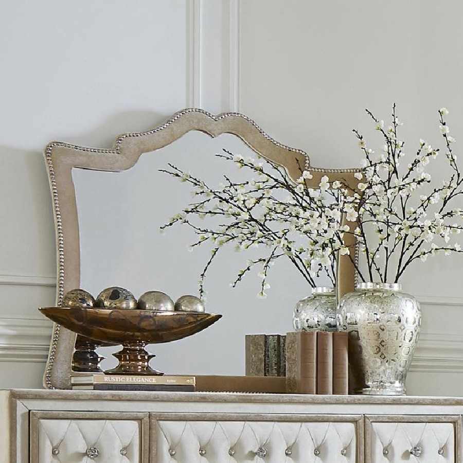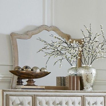 This stately mirror will bring a sense of French Provincial design into your sleeping space. Ideal for pairing with a matching dresser, this is an upholstered mirror with exceptional aesthetic details. A row of nailhead trim adds a textured element to the frame. The exceptional curved design of the frame offers a modern twist on a traditional mirror. Use this mirror to bring glamour and elegance to your bedroom.