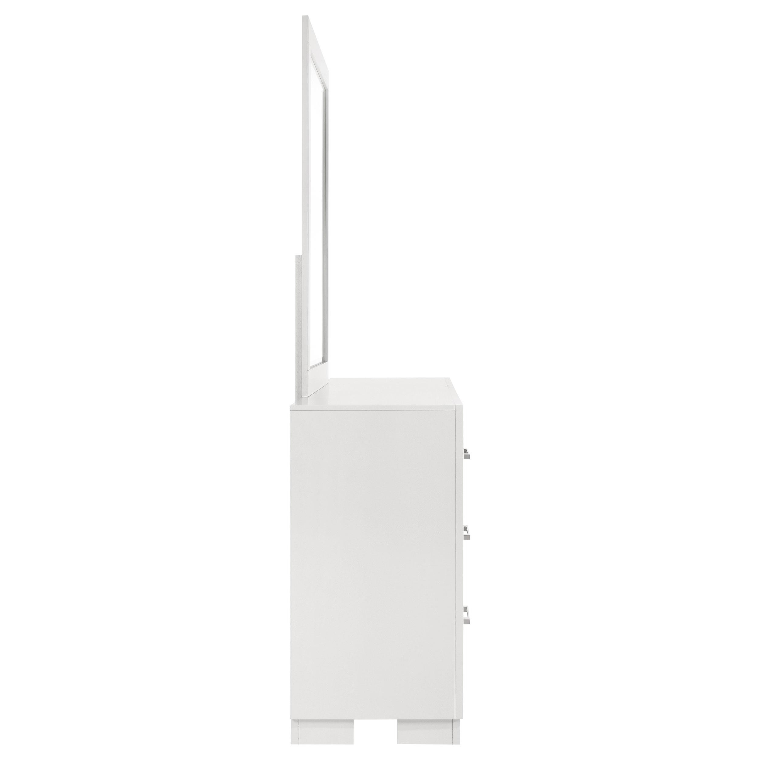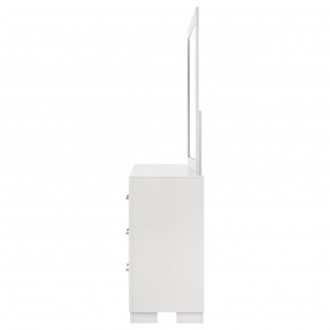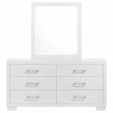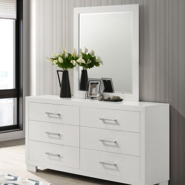 Elegant simplicity defines this dresser and mirror set, offering balance between refined design and everyday function. The six-drawer dresser provides generous storage, while the coordinating beveled mirror brings light and dimension to the room. Sleek bar pulls complement the sturdy wooden construction, creating a harmonious blend of practicality and sophistication. Perfect for modern bedrooms, this pairing completes the space with enduring grace and quiet elegance.