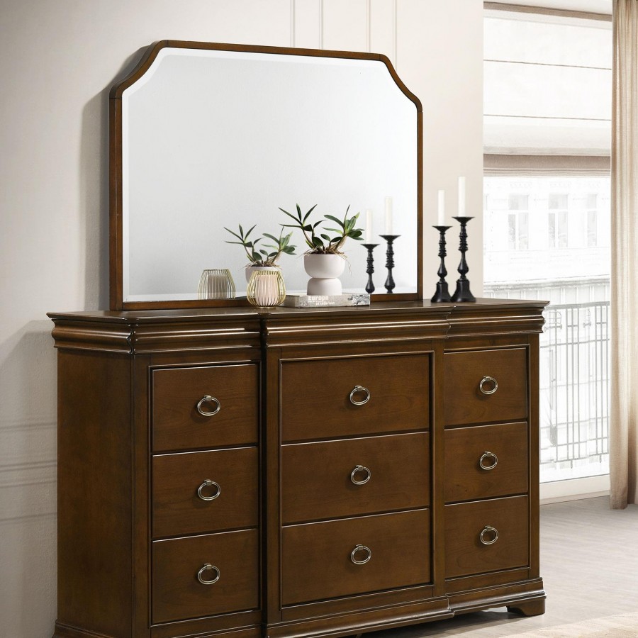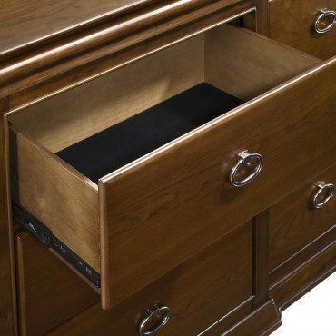 This eleven-drawer dresser with mirror refreshes a classic Louis Philippe silhouette with thoughtful detail and everyday luxury. Nine spacious drawers offer daily organization, while two hidden felt-lined drawers and cedar-lined bottom drawers provide protection for delicate and seasonal items. Crown molding, oval ring pulls, and a shaped mirror frame complete the look. Built from solid rubberwood, engineered wood, and cherry veneer for long-lasting elegance.