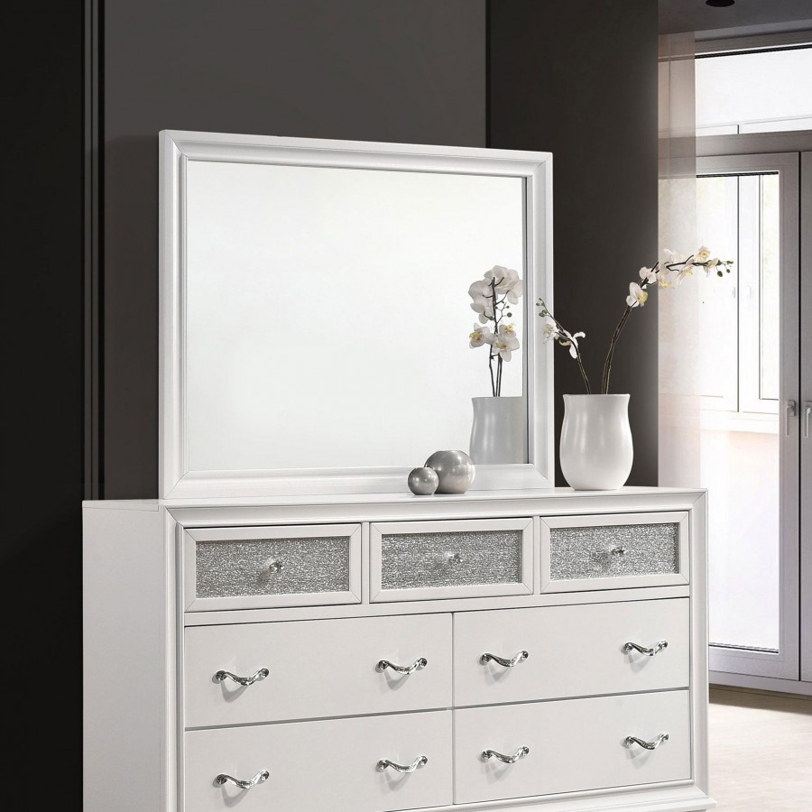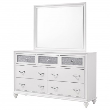 Elevate your bedroom with the glamorous appeal of this dresser and mirror set. The seven-drawer dresser showcases sparkling acrylic panels on its top drawers, complemented by faceted crystal hardware for radiant elegance. A crisp white finish highlights its clean silhouette, while turned bun feet add a timeless touch. The coordinating mirror features a beveled wooden frame that reflects light beautifully, enhancing the dresser’s bold style. Built with solid rubberwood, engineered wood, and okume veneer, this set balances chic design with lasting durability.