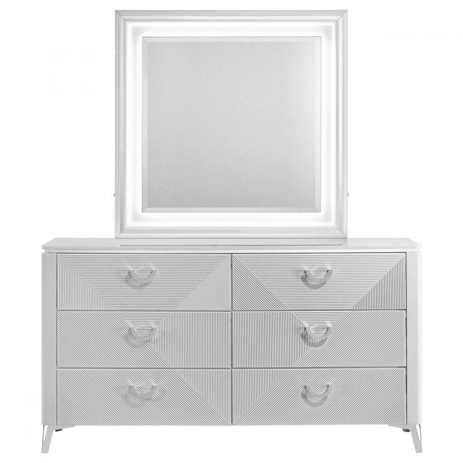 Sophisticated and dimensional, this six-drawer dresser and mirror set makes a bold statement in a high-gloss white finish. The dresser features geometric drawer fronts with fine ribbed texture forming inverted V patterns, paired with polished chrome U-shaped pulls. Black felt lines the top drawers for a touch of refinement, while 45mm metal extension glides ensure smooth operation. Above, the matching mirror glows with integrated white LED trim for ambient lighting and crisp contrast.