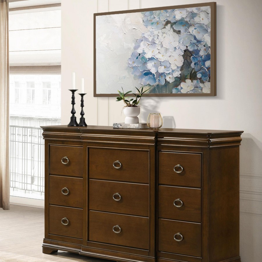 This eleven-drawer dresser delivers elegant functionality with a warm and updated traditional form. Nine full-size drawers provide everyday storage, while two hidden jewelry drawers and cedar-lined bottom drawers offer added protection for delicate items and seasonal wear. Finished in brown cherry with antique nickel pulls, the dresser blends classic detailing with thoughtful upgrades and durable craftsmanship.