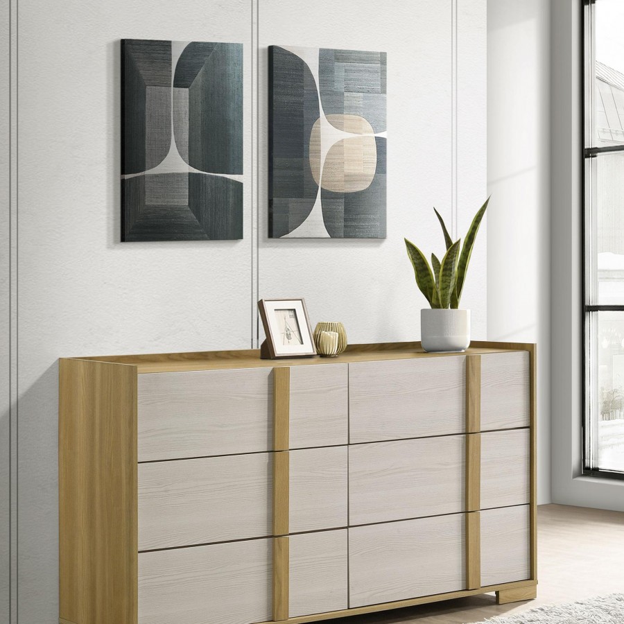 Enhance your bedroom with the contemporary elegance of this six-drawer dresser. Inspired by modern Italian design, it features a sophisticated blend of natural wood tones and crisp white panels crafted from durable, easy-care melamine. The drawers, equipped with metal extension glides and pin-construction joinery, offer smooth operation and ample storage for your clothing and accessories. The vertical lines of the natural finish hardware add a touch of sleek sophistication, perfectly complementing the dresser's clean lines and modern aesthetic. This dresser is not just a storage solution but a stylish focal point that elevates your home decor.