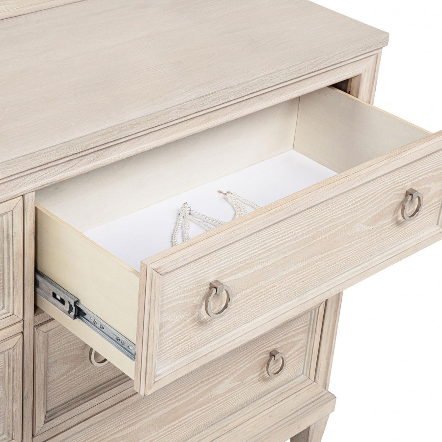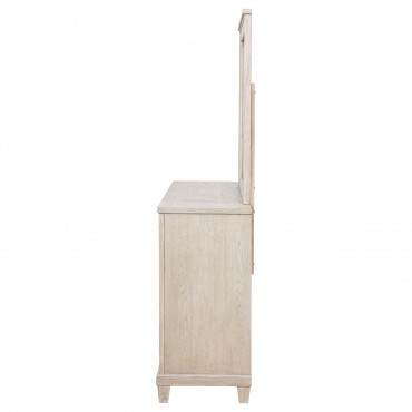 Breezy and balanced, this dresser and mirror set captures the warmth of coastal mornings and the elegance of timeless design. Framed with stepped trim and polished nickel ring pulls, the six-drawer dresser offers generous storage wrapped in washed oak serenity. Above, the mirror reflects light and openness, framed to echo the dresser’s graceful form. Crafted from poplar, oak veneer, and engineered wood, this set brings gentle refinement to the heart of the bedroom.
