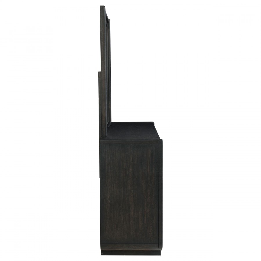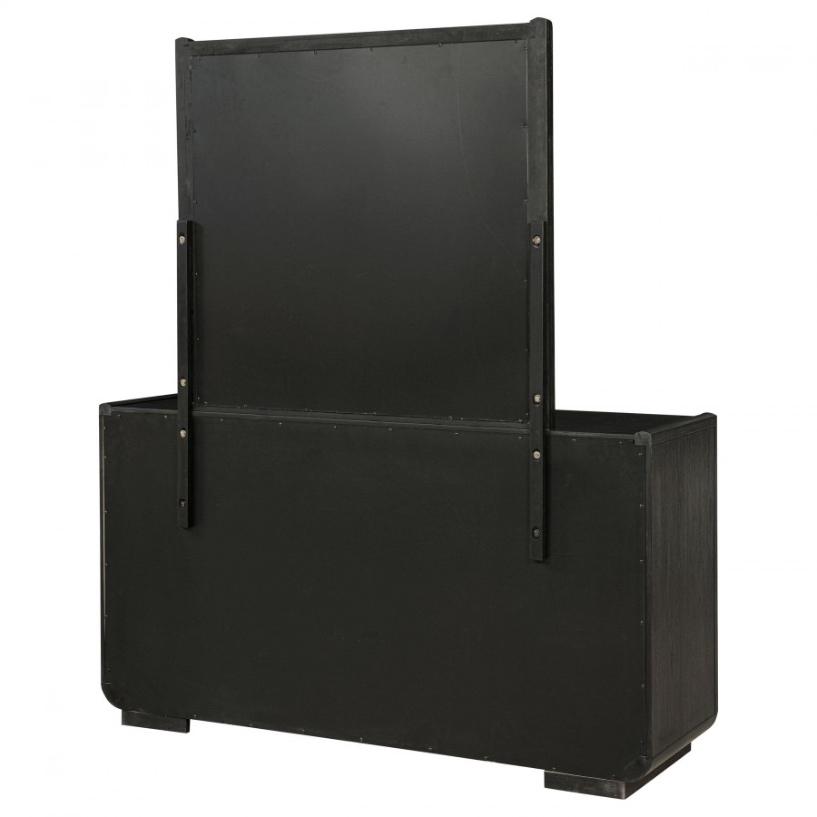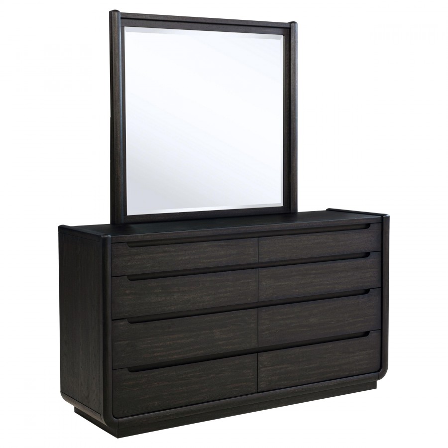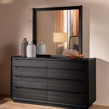 Grounded in grace and softened by design, this eight-drawer dresser and mirror set brings balance to the bedroom with understated elegance. Cloaked in a burnished black finish, the frame curves subtly at the edges for a sculptural feel. Spacious drawers open with quiet ease thanks to soft-closing glides, while black felt lining in the top drawers offers protection for delicate essentials. Above, a minimalist mirror completes the silhouette, reflecting form and light in quiet harmony.