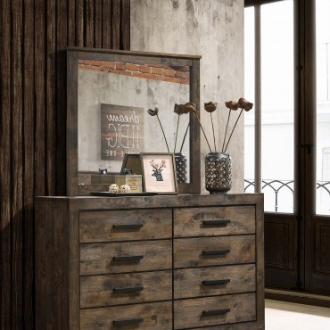 Bring timeless rustic charm to your bedroom with this dresser and mirror set. Crafted in a warm rustic golden brown finish, the dresser showcases natural wood grain details for a rugged yet refined look. Eight spacious drawers provide abundant storage for clothing and essentials, while sturdy wooden handles ensure durability and ease of use. The matching rectangular mirror features a beveled wooden frame in the same finish, enhancing light and balance in your space. Perfect for a cohesive bedroom ensemble, this set blends practical storage with classic country style.