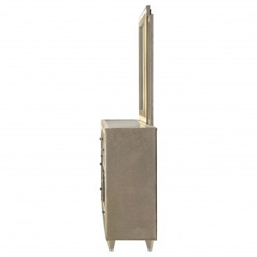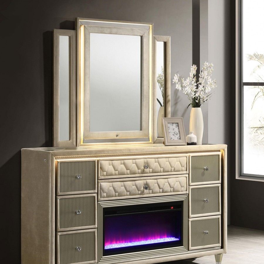Warmth meets radiance in this dresser and mirror set, where ivory and camel velvet surround every surface. A built-in flame visualizer sits beneath a clear tempered glass top, with LED case lighting adding atmosphere. The tri-panel mirror features LED illumination to complete the glow. Finished with crystal knobs, quilted velvet fronts, and felt-lined drawers, this set pairs soft elegance with practical brilliance, all lifted by solid rubberwood legs.