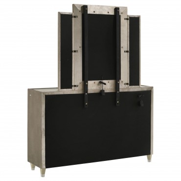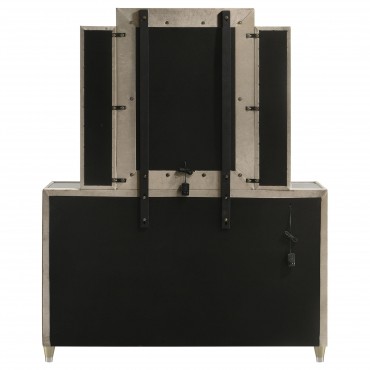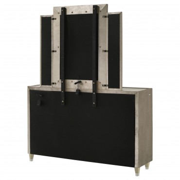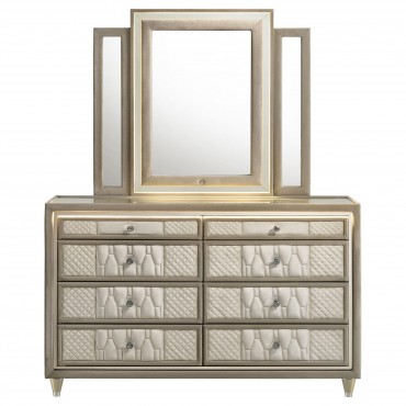 This dresser and mirror set blends soft velvet textures with luminous design for a refined bedroom statement. Fully wrapped in ivory and camel velvet, the eight-drawer dresser features a clear tempered glass top, LED trim, crystal knobs, and reflective acrylic touches. Above, the tri-panel mirror offers LED lighting and velvet framing. With felt-lined drawers, dovetail joints, and solid rubberwood legs, this set balances elegance with enduring practicality.
