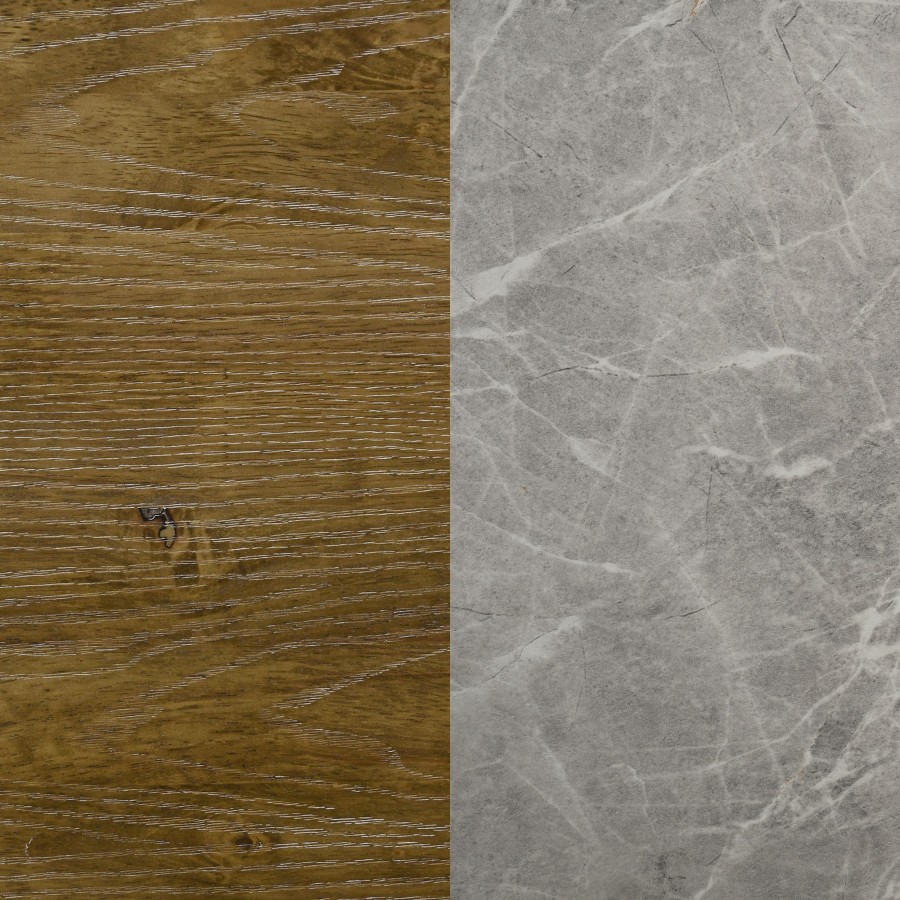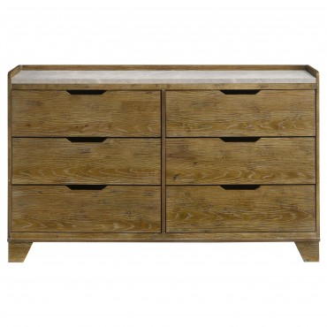 Blending natural warmth with clean-lined simplicity, this six-drawer dresser captures the best of rustic and contemporary design. Crafted from solid rubberwood and finished in a weathered medium oak, it features embossed wood grain surfaces that add character and depth. A faux marble melamine top introduces subtle contrast, while sculpted finger pulls and metal extension drawer glides offer seamless daily use.