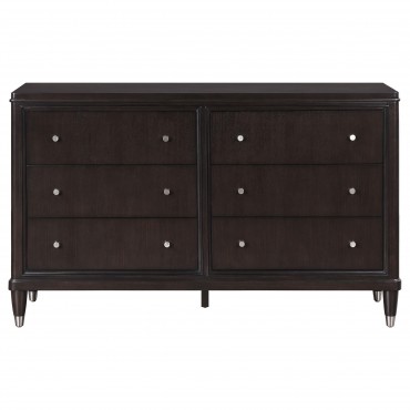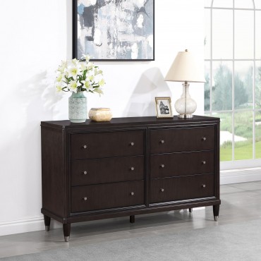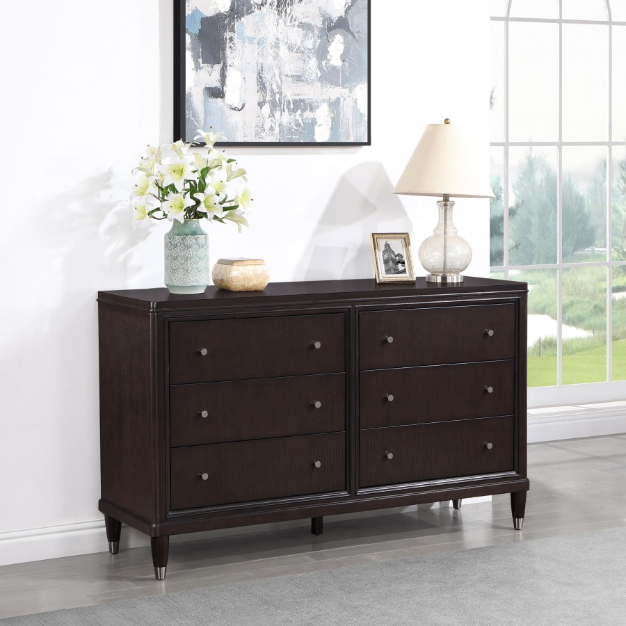 Introduce stylish storage in your bedroom with a modern six-drawer dresser. Its sleek look is accentuated in a dark brown finish, with metallic accents that add depth to tapering feel. Petite knobs decorate each drawer front as drawers offer ample storage for clothing, linens and accessories in your bedroom. The dresser offers a wide top for decor and drawers add protection with felt lining in top drawer and cedar lining and bottom drawers. Add framed photos or a metal sculptural piece to the top of the dresser to add a personal touch.