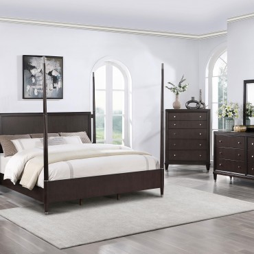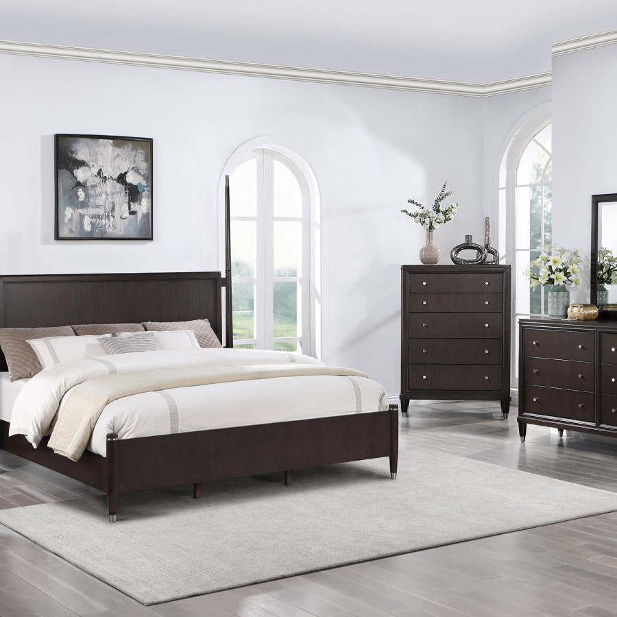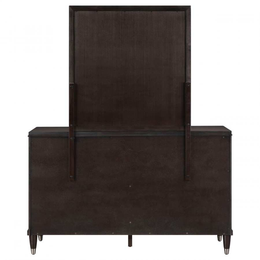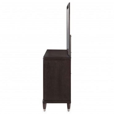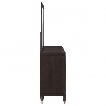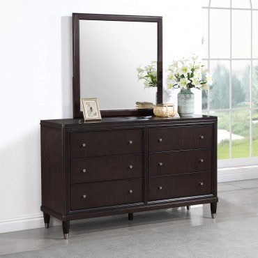 Bring stylish flair and plentiful storage to your bedroom with a modern six-drawer dresser and mirror. It showcases a dark brown wood finish, paired with silver-toned round knobs and ferrules on its legs that add gleaming contrast and depth. Six drawers provide ample storage and organization for clothing and accessories, with a red-brown velvet lined jewelry tray included that's ideal for protecting pieces you wear regularly. The mirror on top of the dresser creates a vanity like space, and is framed for a finished look and feel. This stylish dresser is the perfect addition to your existing bedroom ensemble.