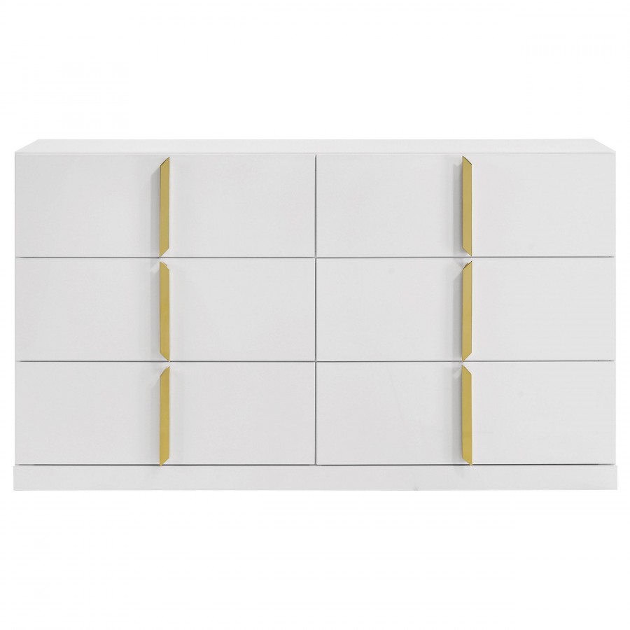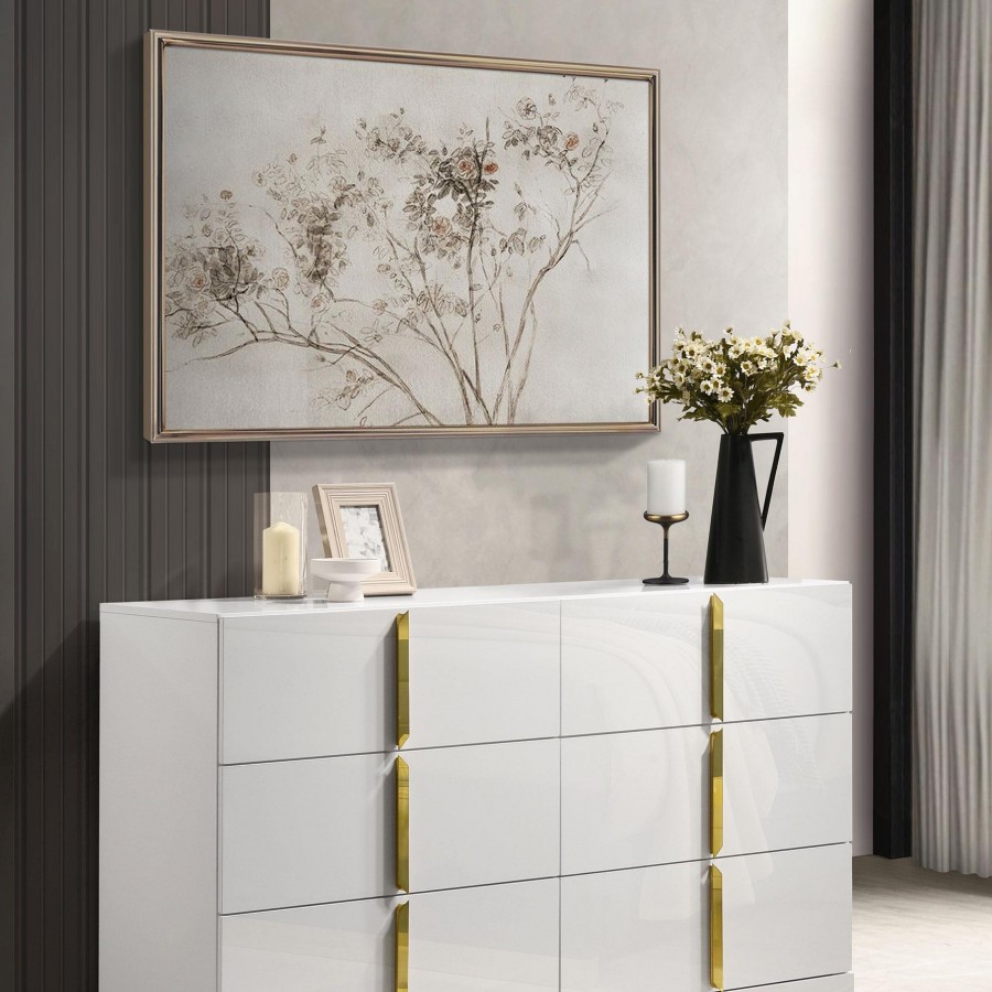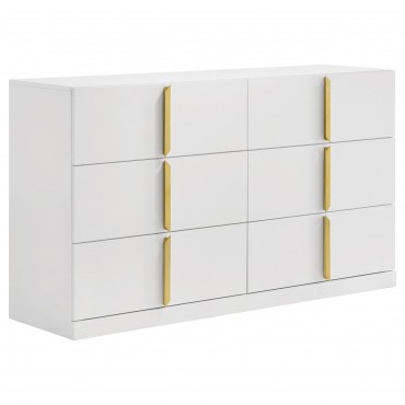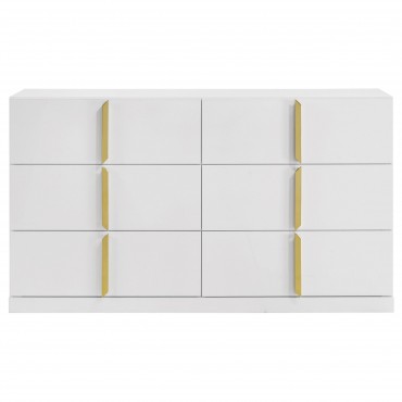 Clean and structured, this six-drawer dresser draws from Italian contemporary style to deliver bold presence and refined function. Finished in white high gloss PET thermoplastic, it offers a scratch-resistant, moisture-resistant surface that is both durable and eco-friendly. Vertically mounted polished gold pulls create a sculptural centerline across six smooth-gliding drawers, combining sleek storage with standout design.