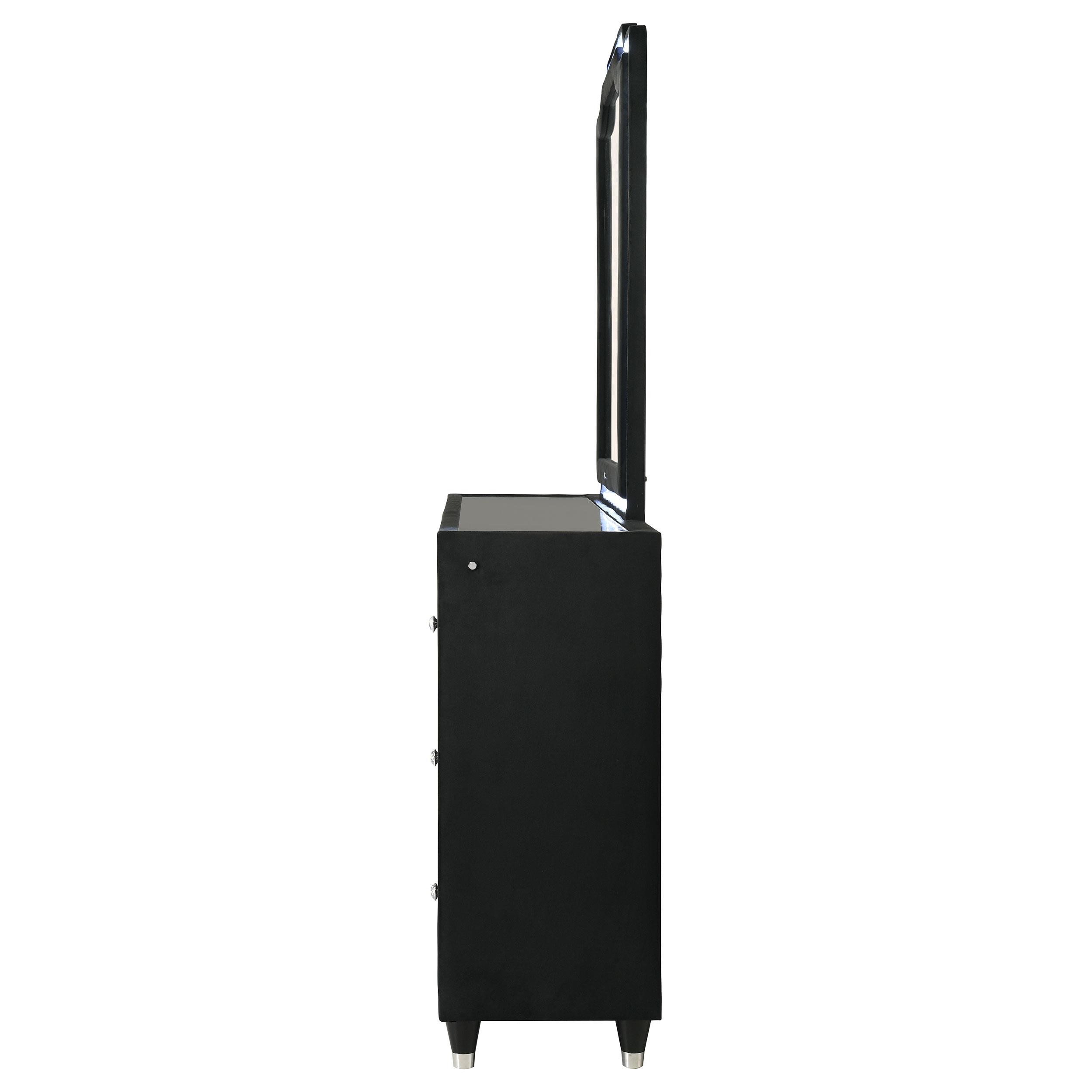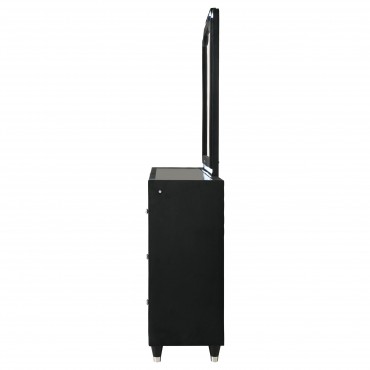 Warmth meets radiance in this dresser and mirror set, where black velvet surround every surface. A built-in flame visualizer sits beneath a clear tempered glass top, with LED case lighting adding atmosphere. The tri-panel mirror features LED illumination to complete the glow. Finished with crystal knobs, quilted velvet fronts, and felt-lined drawers, this set pairs soft elegance with practical brilliance, all lifted by solid rubberwood legs.