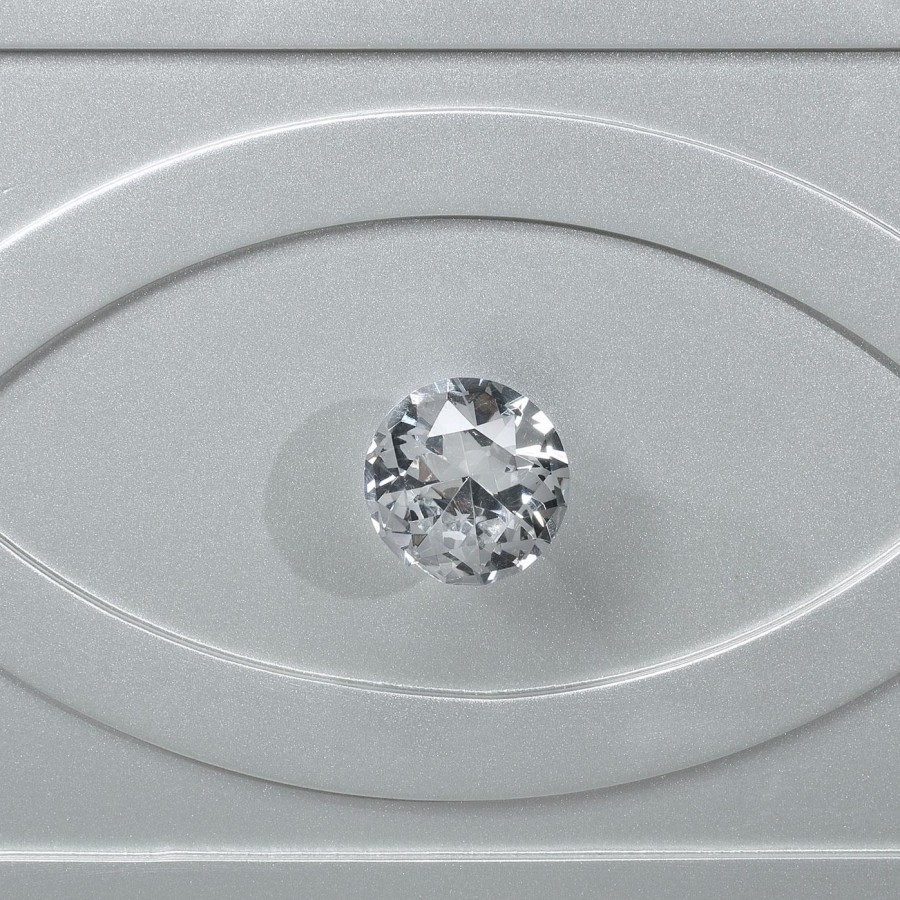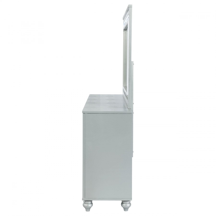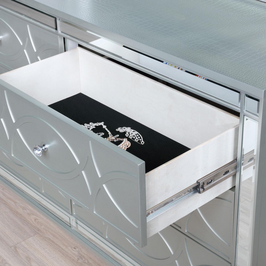 Transform your bedroom with the transitional elegance of our six-drawer dresser and its accompanying mirror. The dresser's vibrant silver metallic finish and fret work detail on the front panels exude modern glam, while the crystal-like pulls and black felt-lined top drawers add a touch of luxury. Delicate bun feet complete this exquisite dresser, making it a stunning showpiece. The rectangular mirror, with its decorative fret work frame and beveled edges, enhances the glamor and radiates sophistication, perfect as a standalone piece or paired with the dresser.