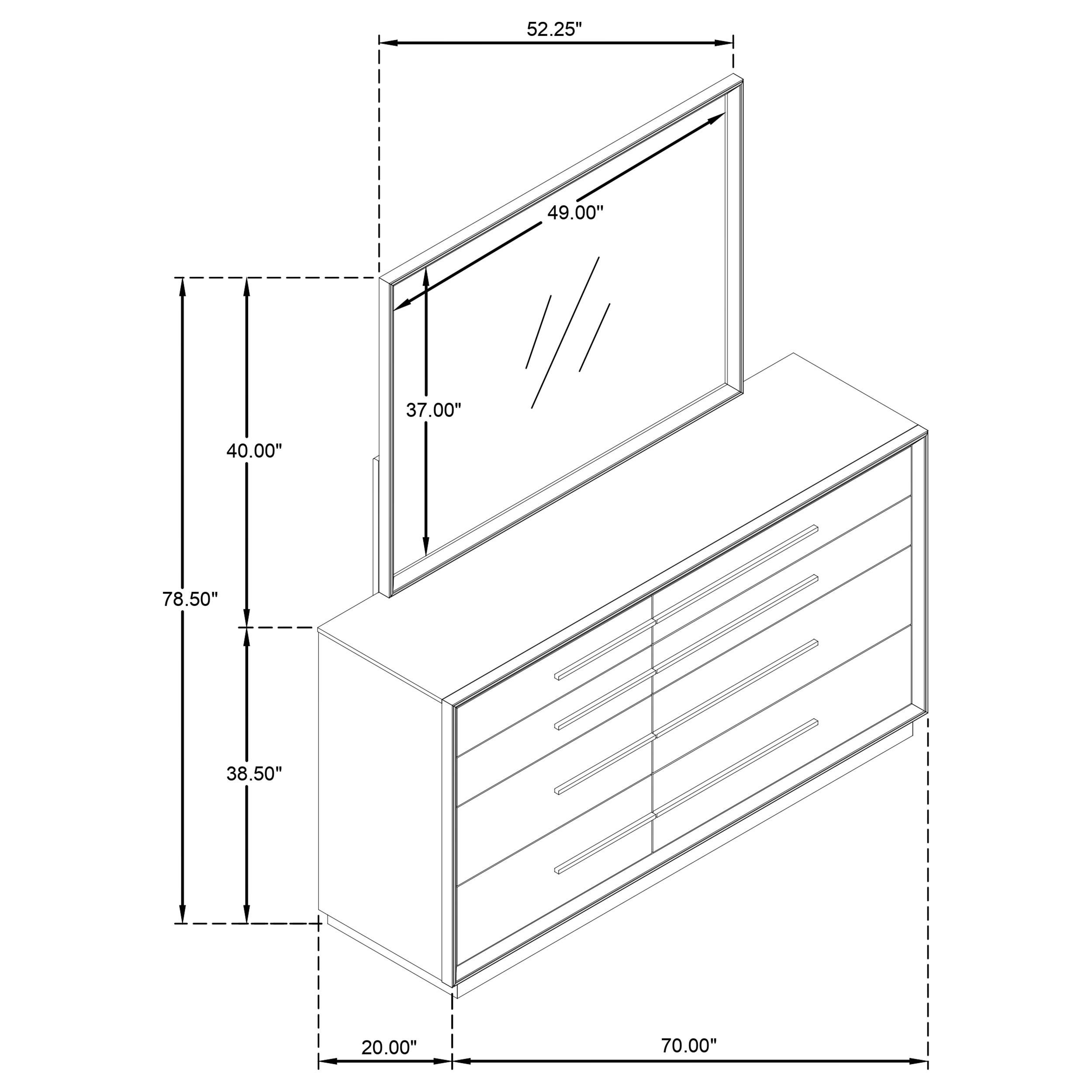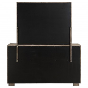 Augment storage and style in your bedroom with a transitional eight-rawer dresser and mirror combination. It features a clean-lined silhouette in a neutral taupe oak wood finish. The front of the case features mitered trim and extra-long bar pulls that highlight an asymmetric center line that creates drawers of different sizes. A wide top is complete with framed mirror, echoing the mitered trim to create a sense of depth and dimensionality. Choose a decor piece or two to inject personalized style.