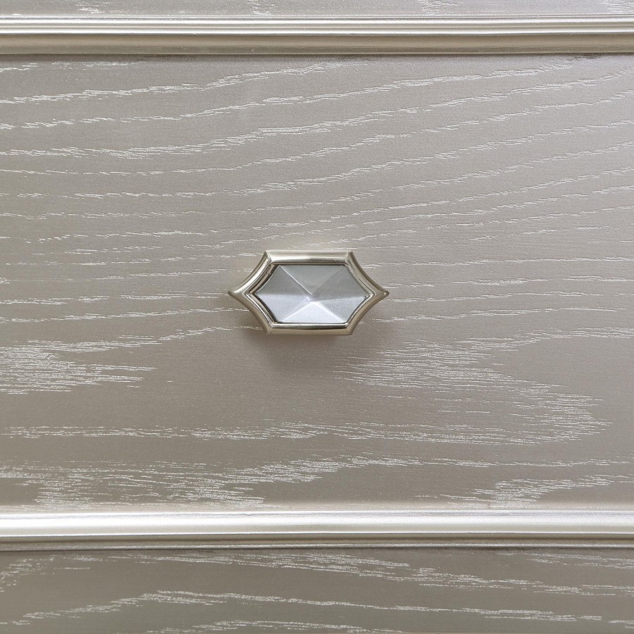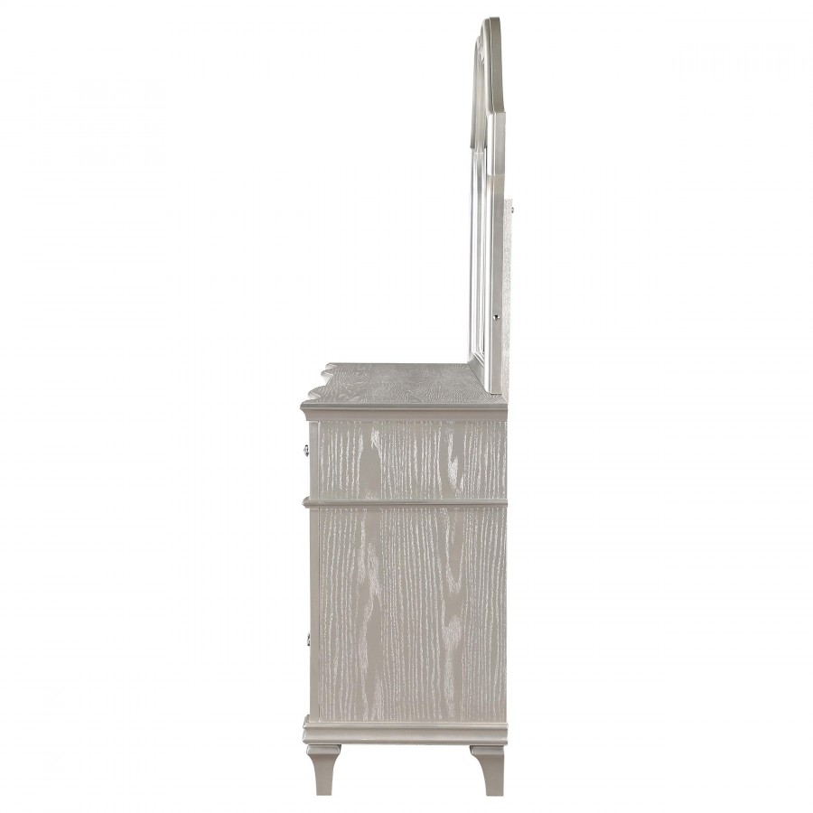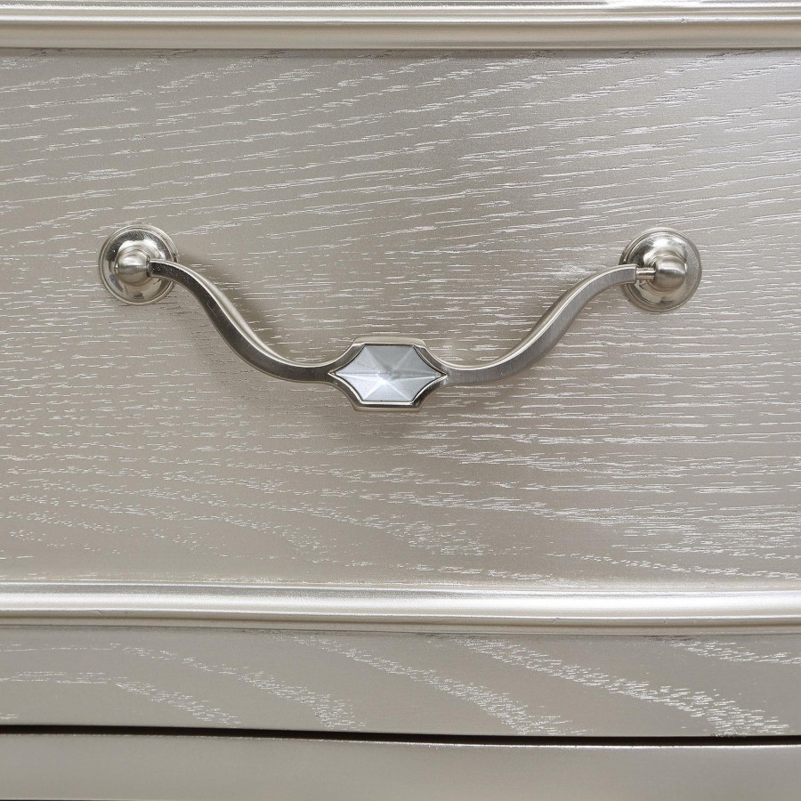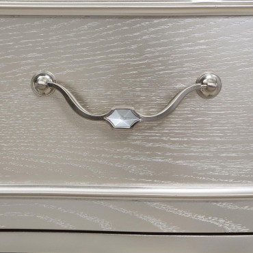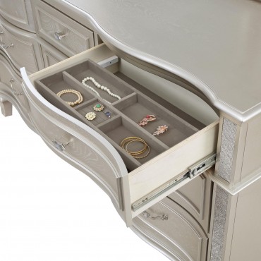 Discover the epitome of elegance and luxury with our exclusive dresser and mirror bundle. The nine-drawer dresser, adorned in a lustrous silver oak finish, features hexagon-shaped knobs and drop bail handles with pearl accents, creating a glamorous sanctuary in your bedroom. Delicate essentials find a home in the grey felt-lined top drawers, while the deep bottom drawers offer ample space for garments. The dresser's curved facade and sparkling columns harmonize with the mirror's double arched design and glittering side panels, bringing a cohesive and stately presence to your space. Together, they form a lavish ensemble that combines classical charm with modern glamor, transforming your bedroom into a haven of sophistication.
