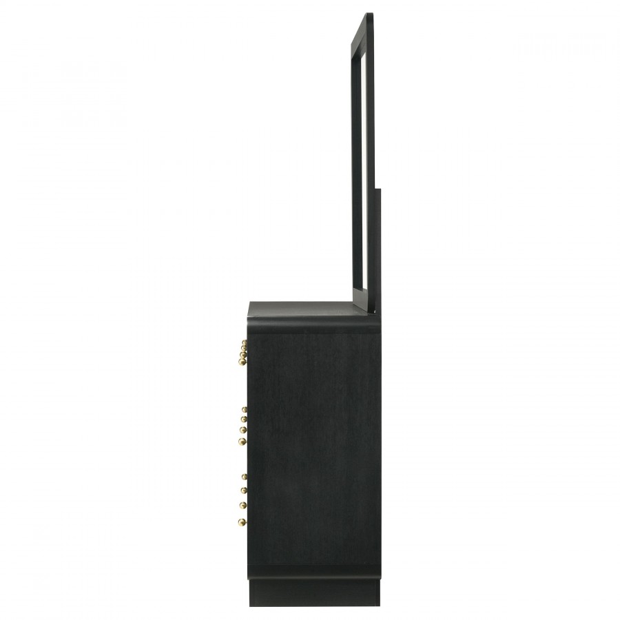 Augment bedroom storage with the plentiful drawer space and stylish presentation of this modern dresser and mirror combination. Its six large drawers facilitate easy organization of clothing and accessories. Each drawer is accentuated with ball knobs in a brass finish, offering warmth and contrast. The dresser and mirror each feature a black finish with rounded corners that soften the bold look and feel. The mirror pairs with a recessed base, each serving to lighten the overall look of this striking dresser.