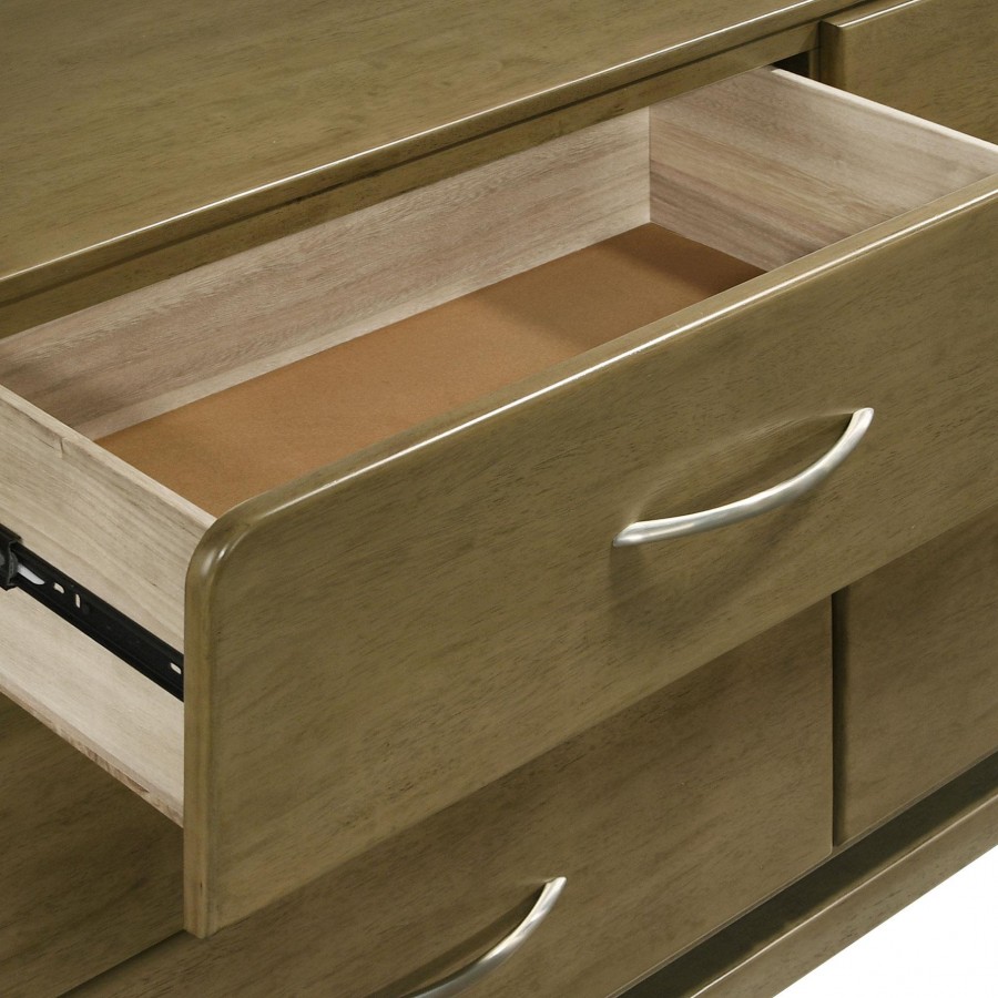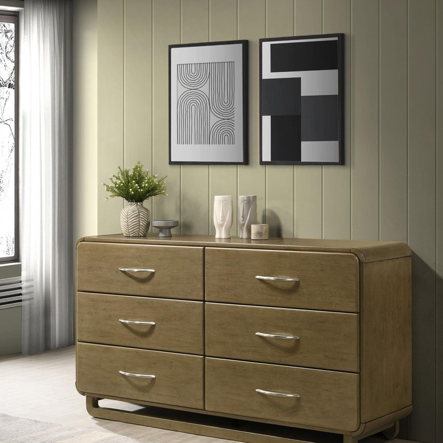 This six-drawer dresser offers a modern and sleek storage solution for your bedroom. The nutmeg wood finish exudes warmth while the rounded corners add a soft, contemporary touch to the design. Each drawer is equipped with metal extension glides, ensuring smooth and effortless operation. The dresser's minimalist design is enhanced by the matte nickel hardware, creating a stylish and practical piece. Crafted from solid rubberwood, this dresser is built to last while elevating your bedroom decor.