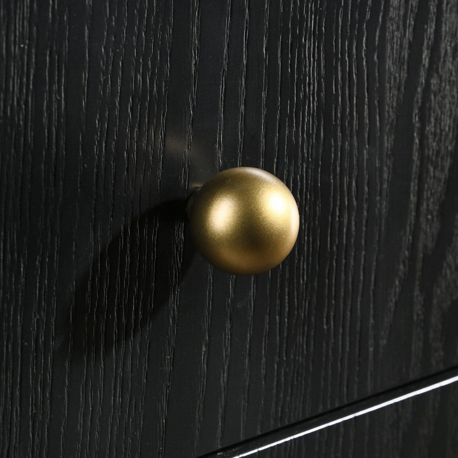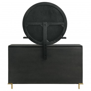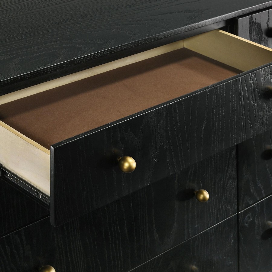 Upgrade clothing storage in your bedroom or dressing area with a modern eight-drawer dresser. Its dark brown wood grain finish is deep and warm, perfect for a variety of spaces. It's augmented with gold finish knobs and legs, offering the perfect dose of warmth and contrast. The dresser includes felt lining in its top drawers, great for delicate items. A wide top is complete with a round mirror and compact jewelry tray, offering a hint of delicacy and engaging character.