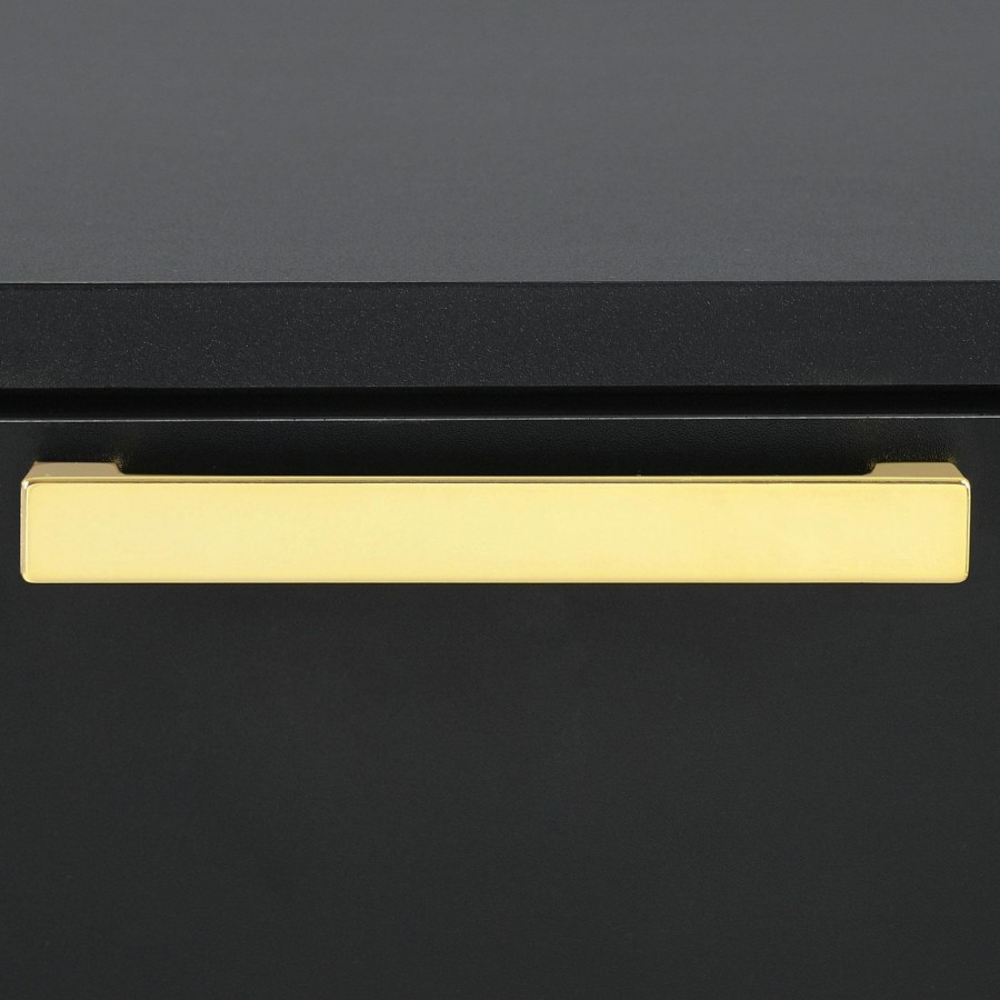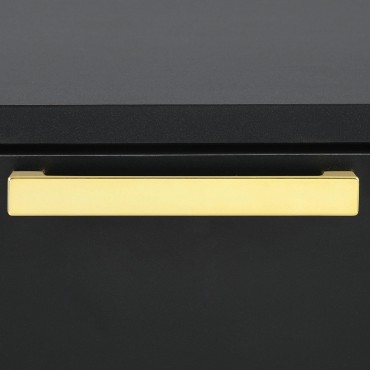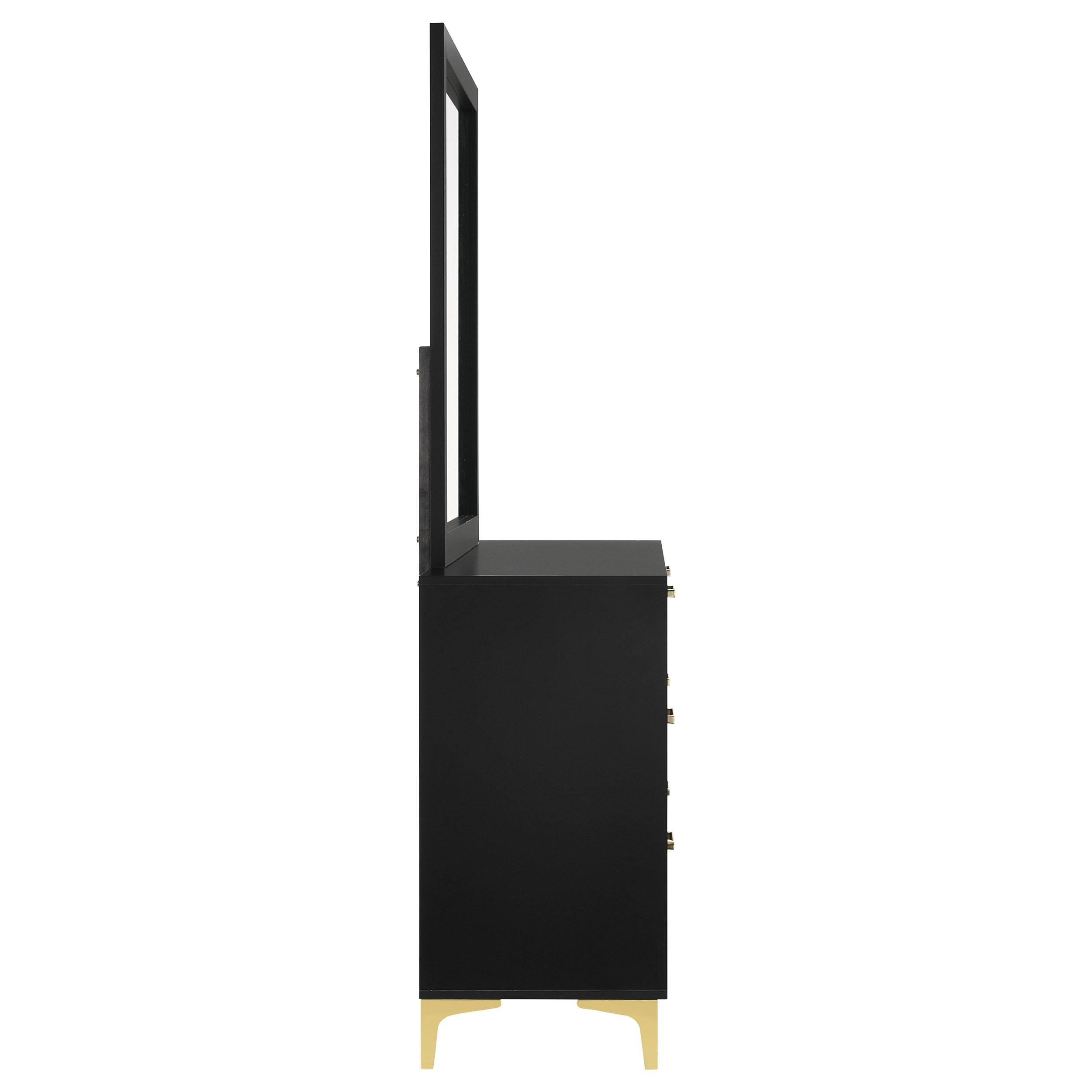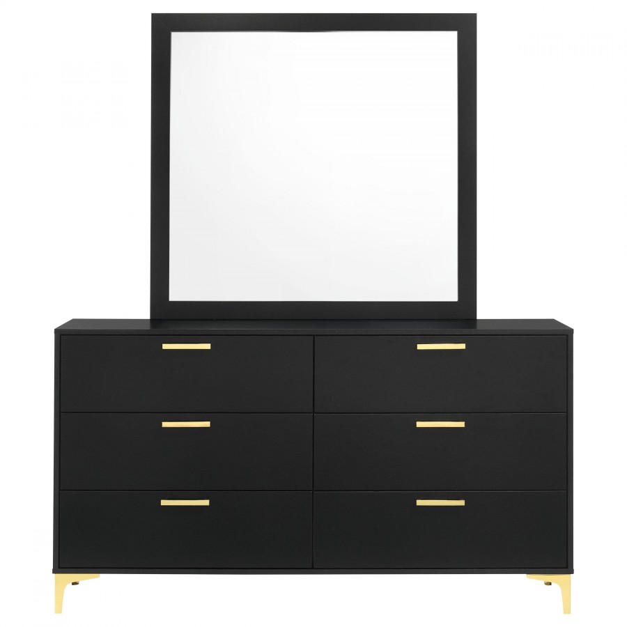 Elegance meets functionality in the 224453M Dresser and Mirror set, with its modern glam design that maximizes your space while offering ample storage. The sleek dresser's boxy black frame and six spacious drawers provide a bold and organized focal point in your bedroom. Each drawer, accented with slender gold pull handles, contrasts beautifully with the black finish, while the gold bracket legs echo the metallic theme. The accompanying mirror's tall, clean-lined frame enhances the setup, creating an ideal vanity space that blends seamlessly with any color palette. This set is not just a statement piece; it's a testament to sophisticated design that serves everyday needs with style.