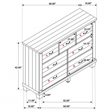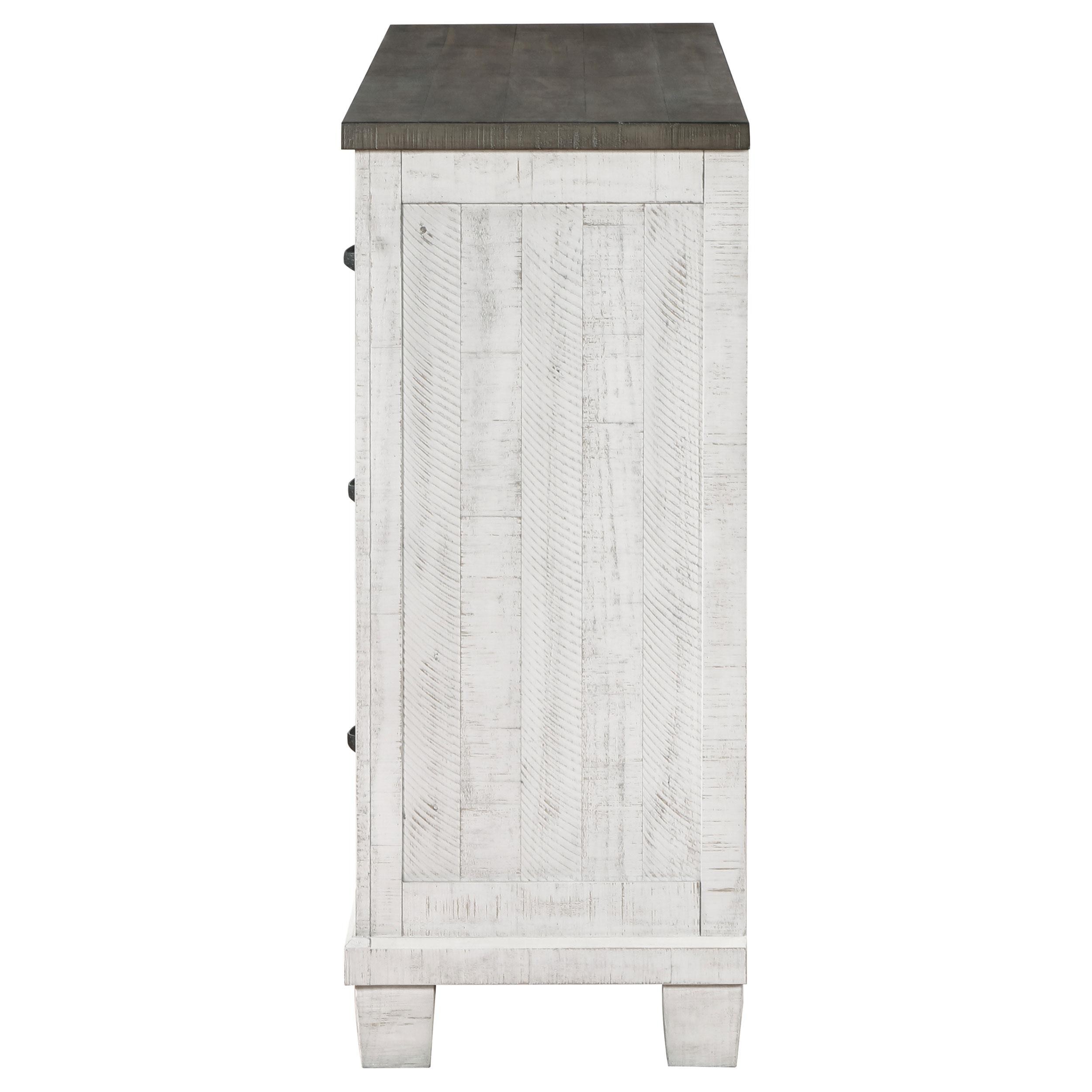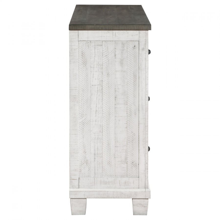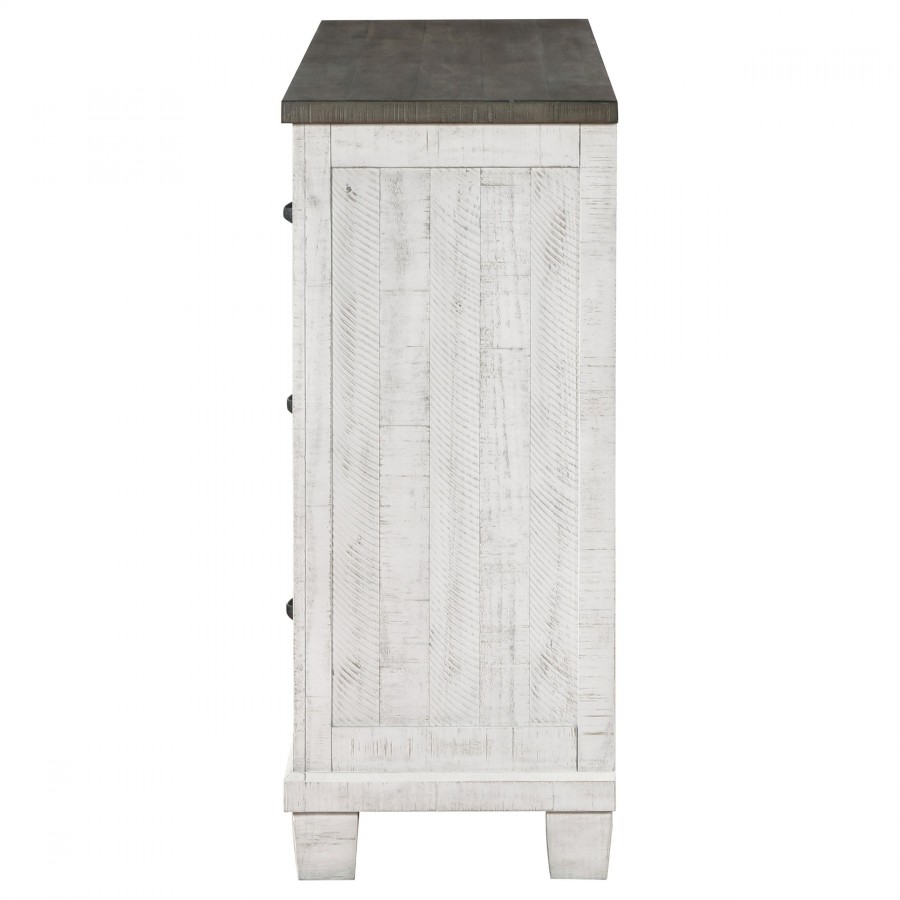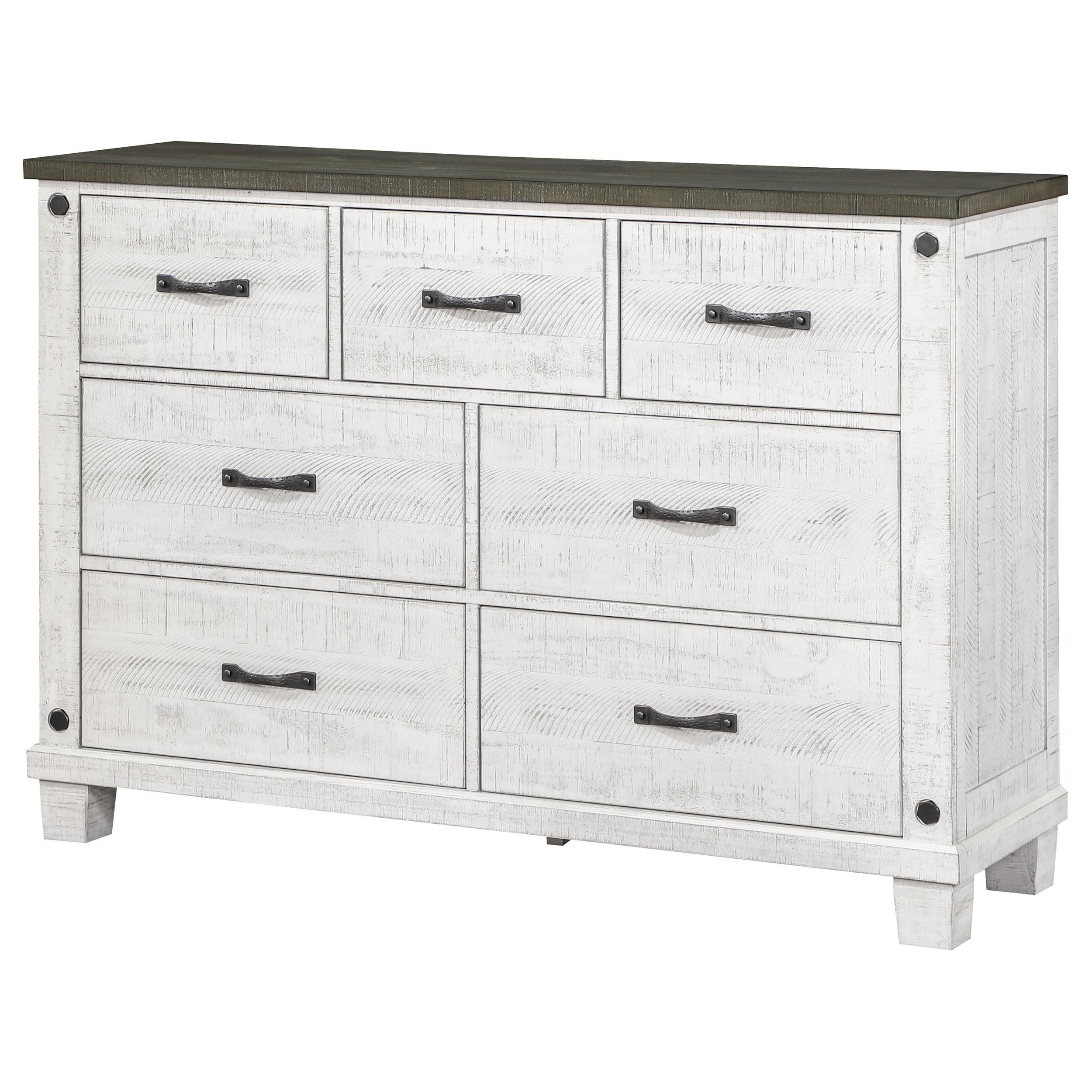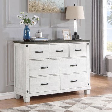 Introduce ample storage and rustic style to your bedroom with a seven-drawer dresser. Three upper drawers are ideal for smaller items and delicates, while four lower drawers beneath create space for jeans, sweaters and more. The dresser shows off a lightly distressed white finish, paired with a contrasting gray top that creates depth and contrast. Hexagonal bolt heads augment the front of the drawer case, and each drawer front is complete with a classic curved handle for easy operation. The dresser is designed with metal extension glides for smooth performance, and offers English dovetail joinery for lasting durability.