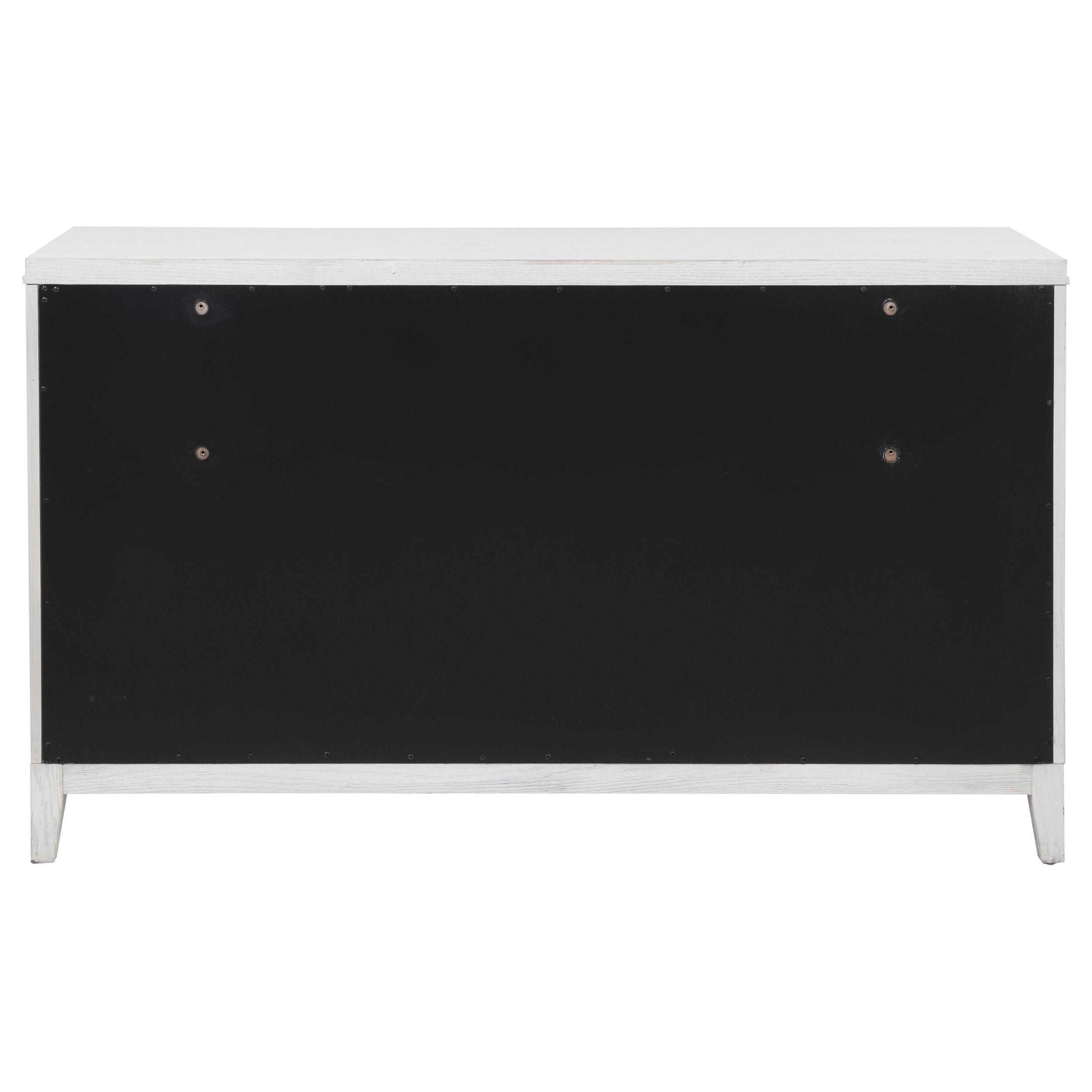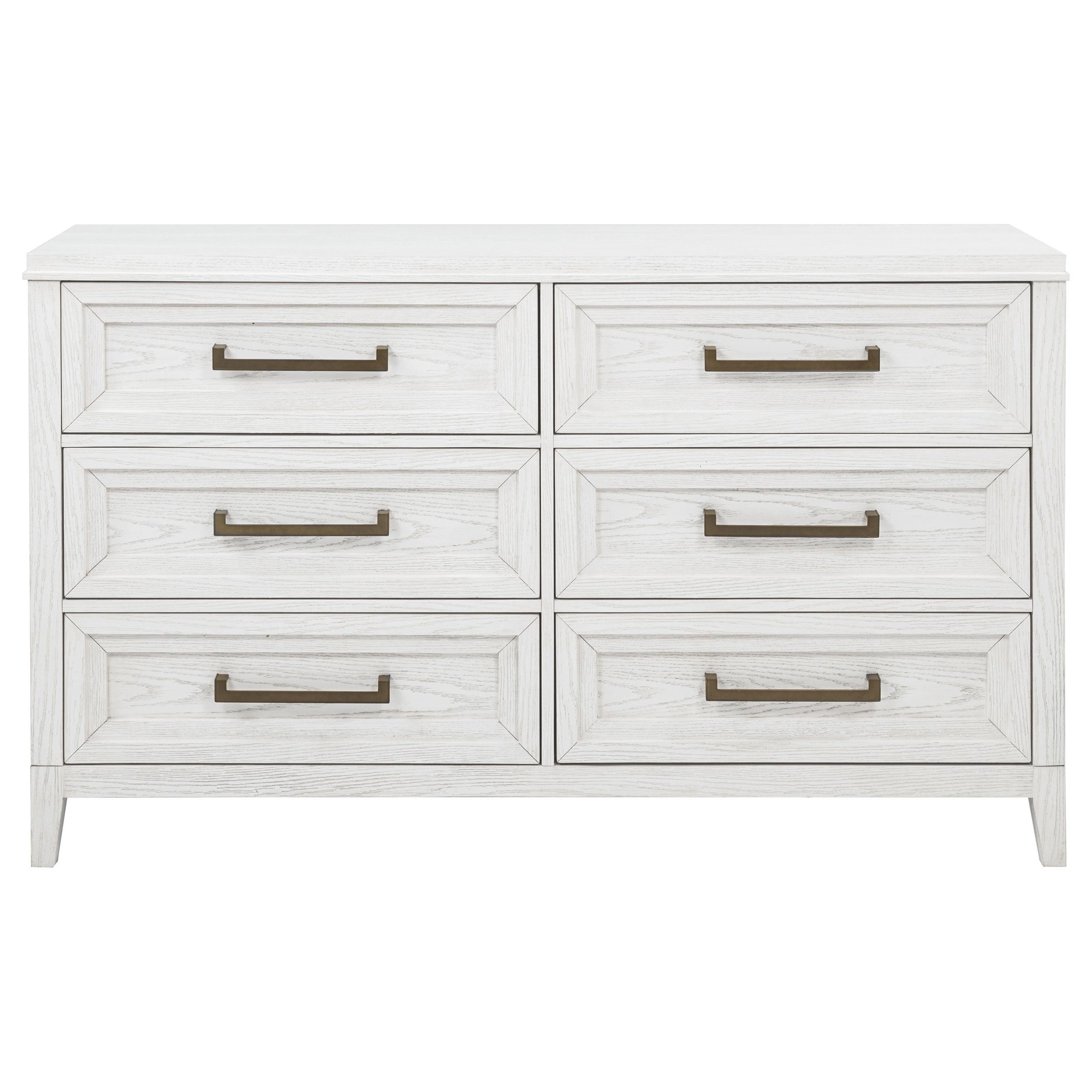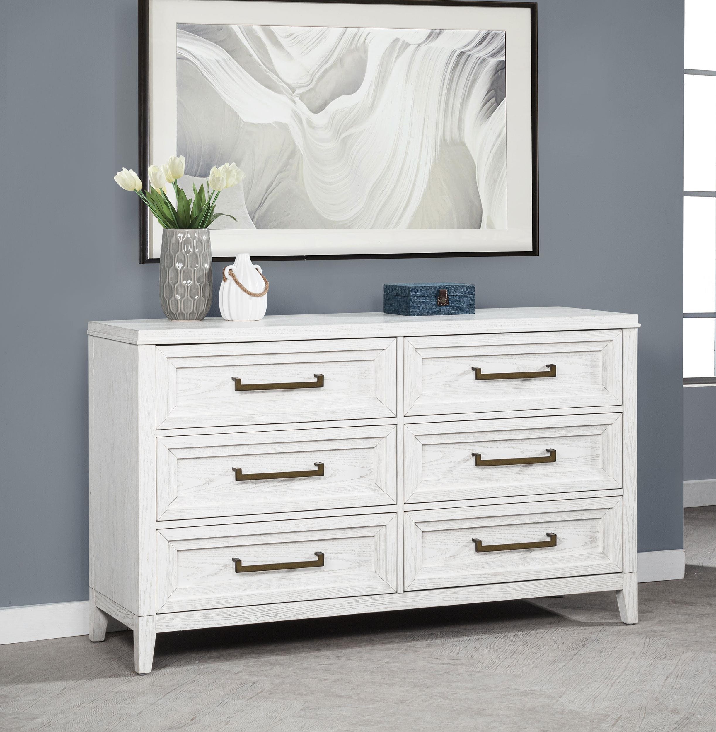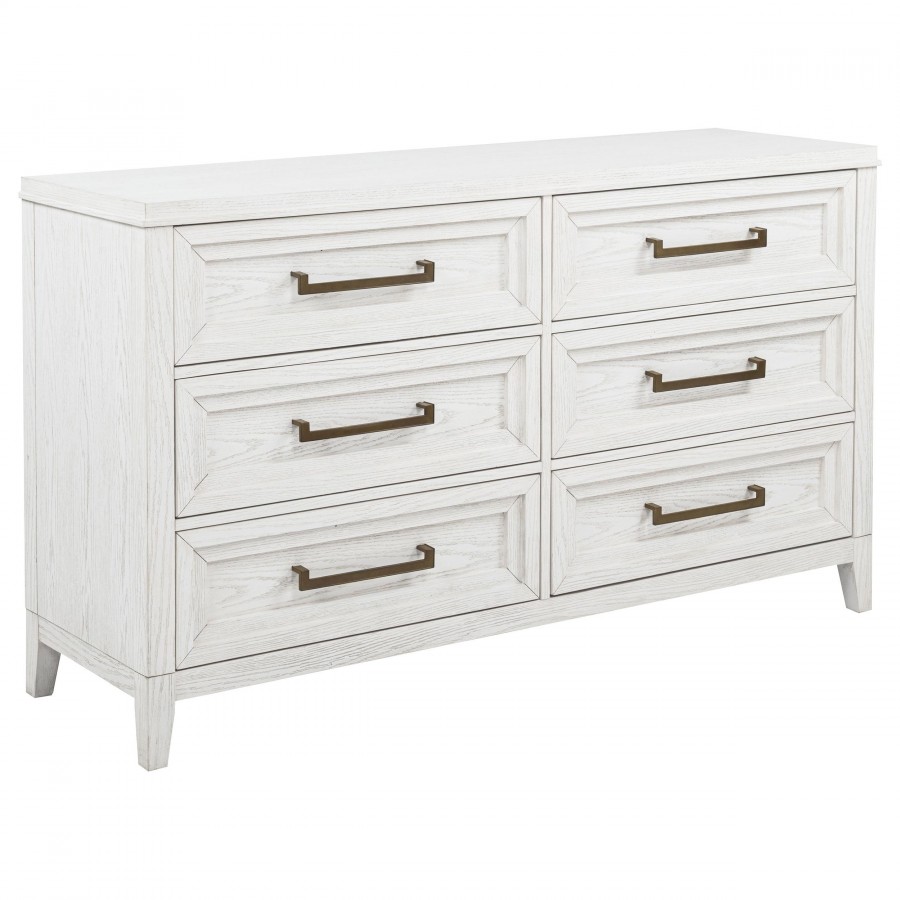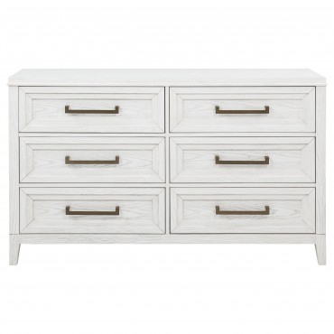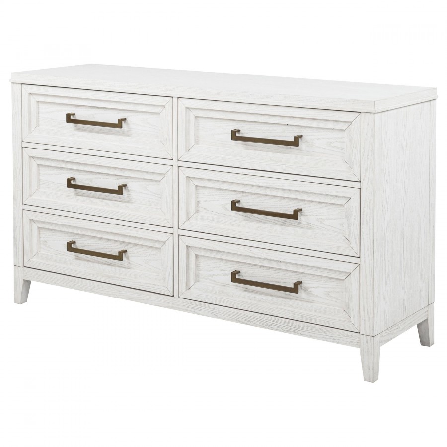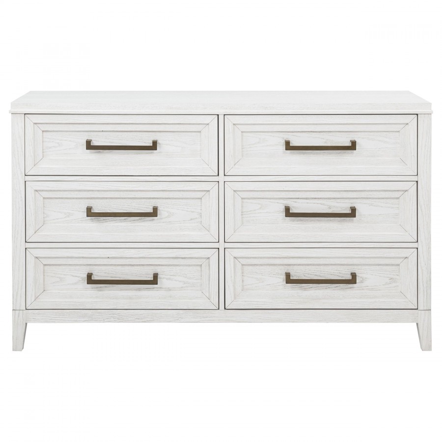 Light distressing offers depth and dimensionality to a modern six-drawer dresser. Perfect for clothing and other accessories, it features a double profile with three drawers on each side. A white finish allows wood grain details to show through, creating organic character and texture. Drawer fronts are a stepped design that adds artistry, with long antique brass toned pulls that add contrasting depth. use the wide top for personal effects like a jewelry box or valet and framed photos.
