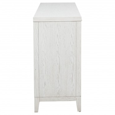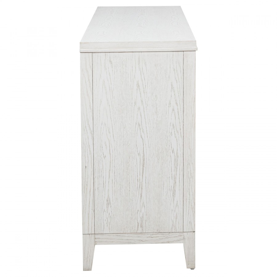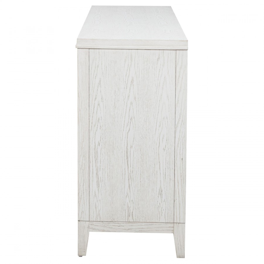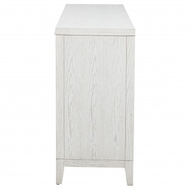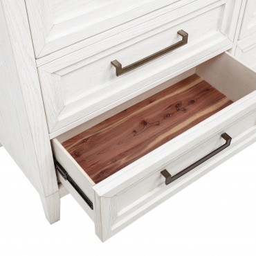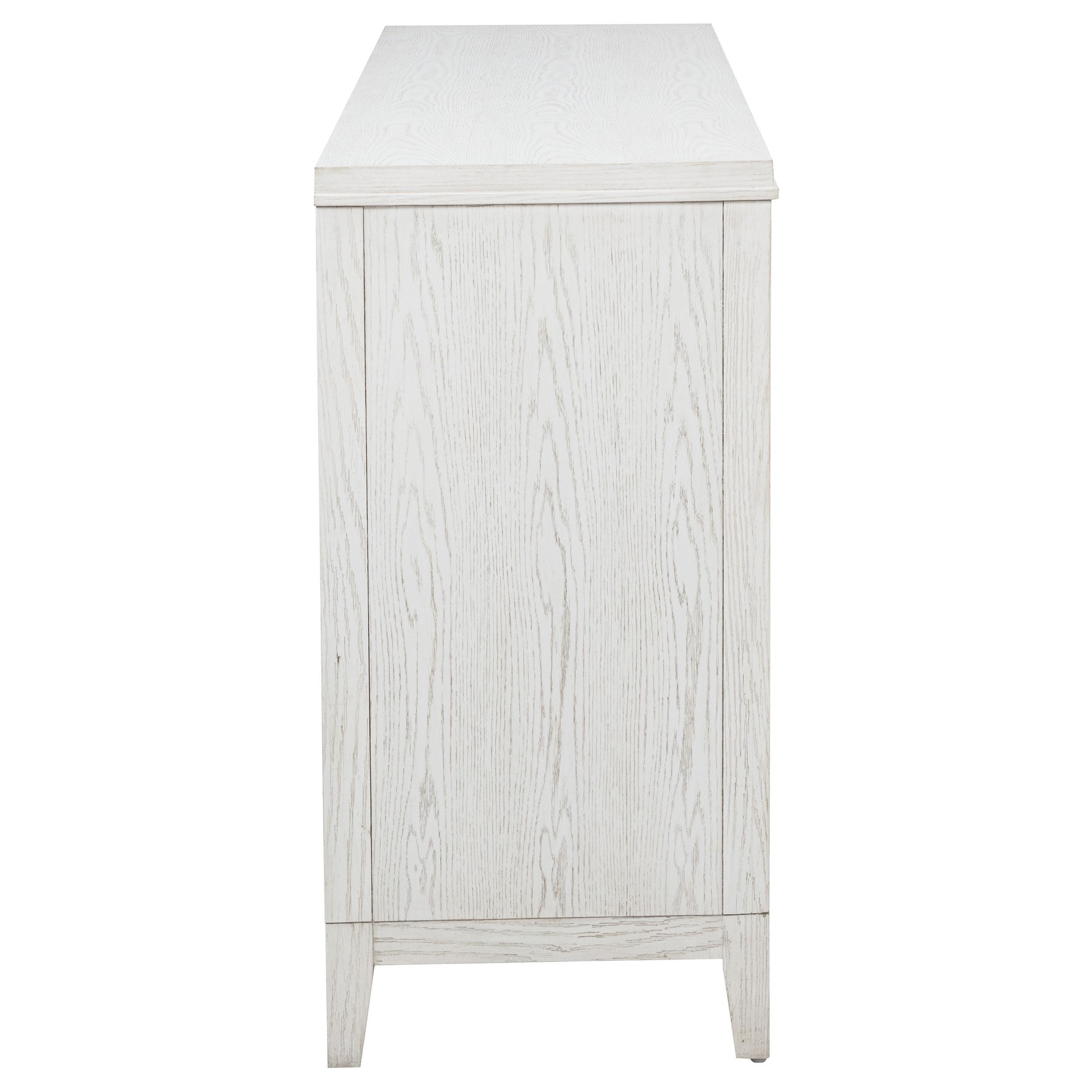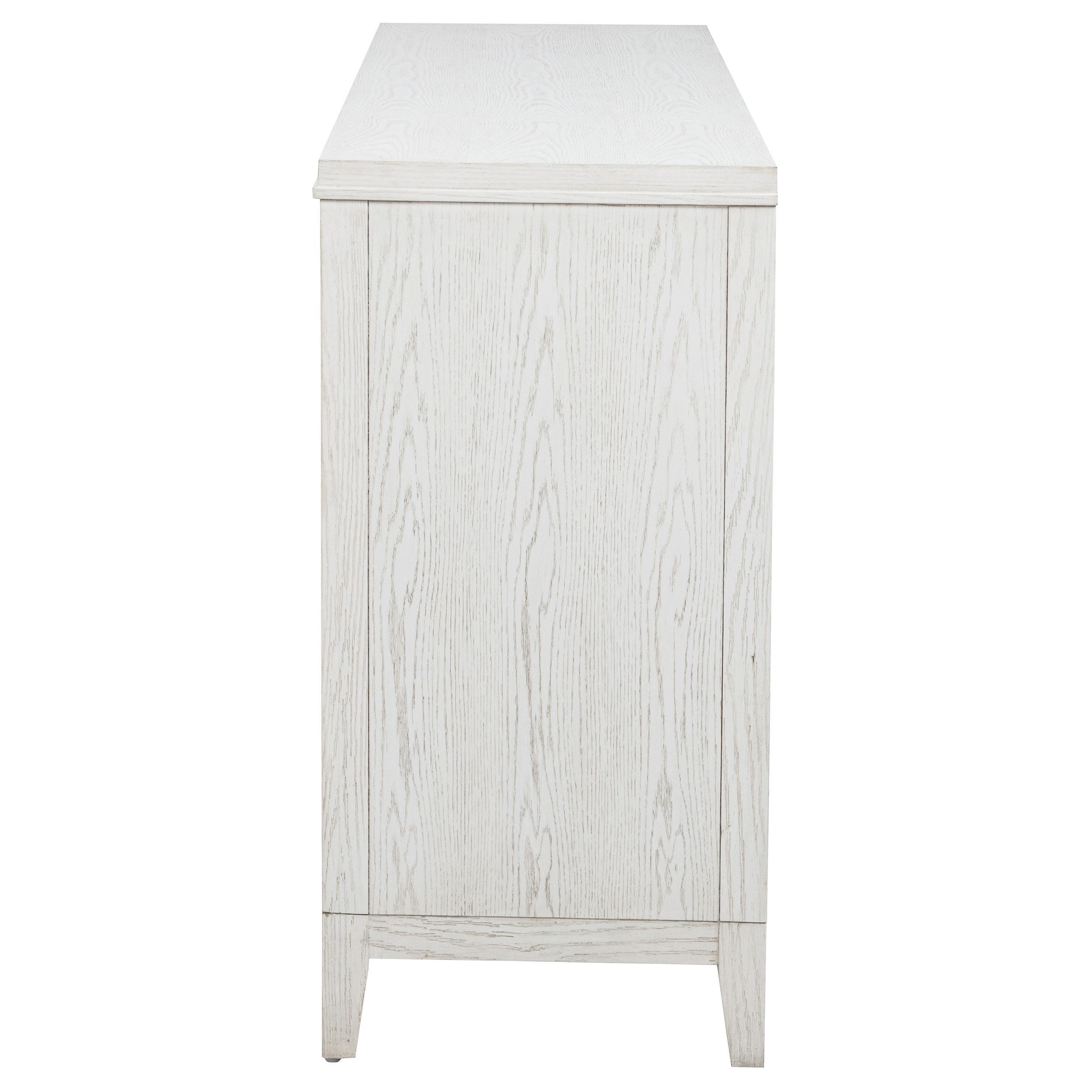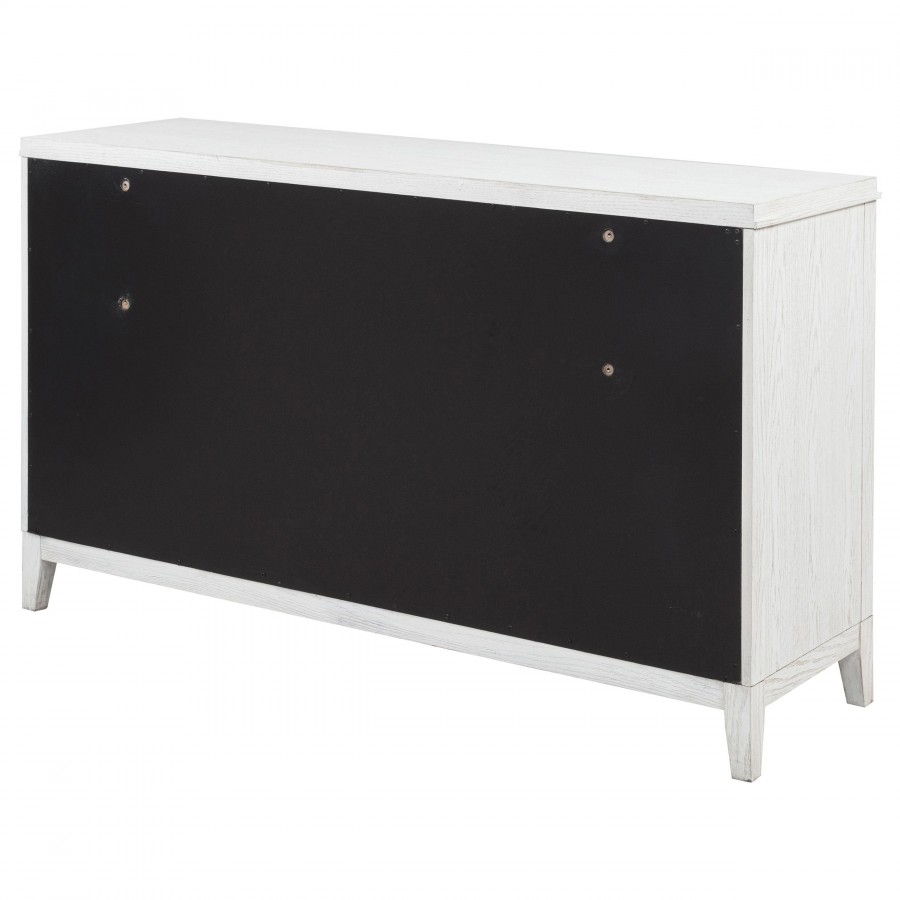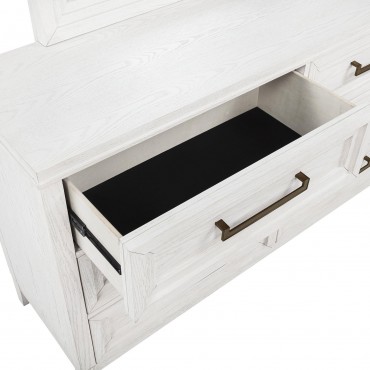 Light distressing offers depth and dimensionality to a modern six-drawer dresser. Perfect for clothing and other accessories, it features a double profile with three drawers on each side. A white finish allows wood grain details to show through, creating organic character and texture. Drawer fronts are a stepped design that adds artistry, with long antique brass toned pulls that add contrasting depth. use the wide top for personal effects like a jewelry box or valet and framed photos.