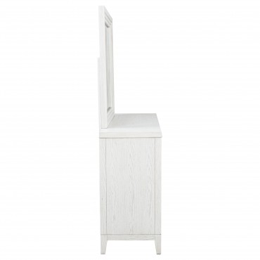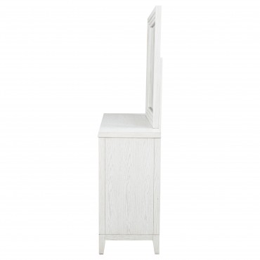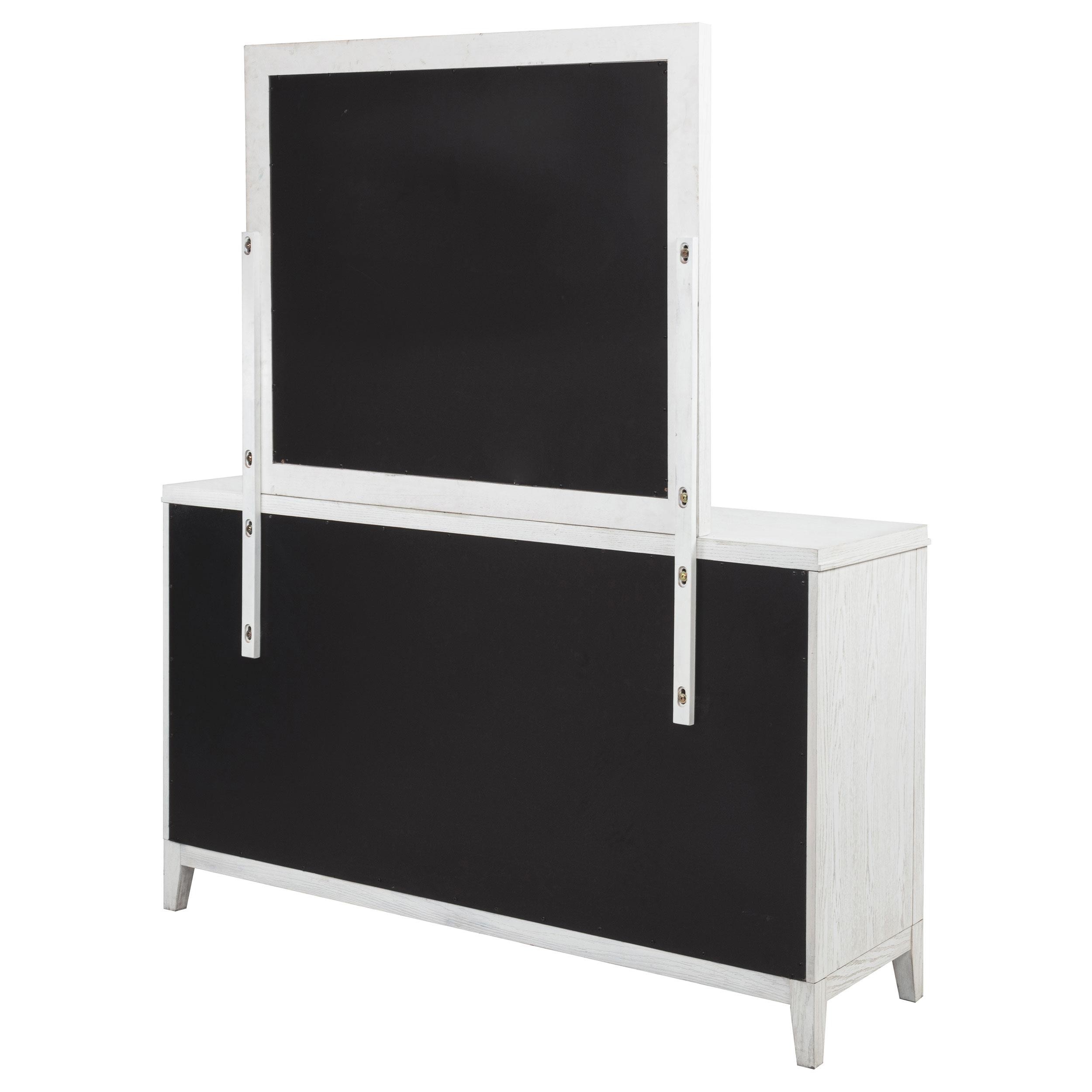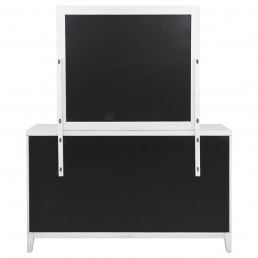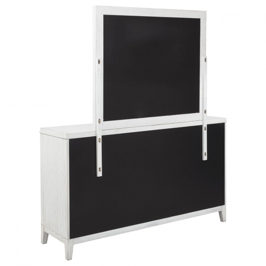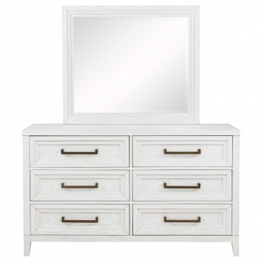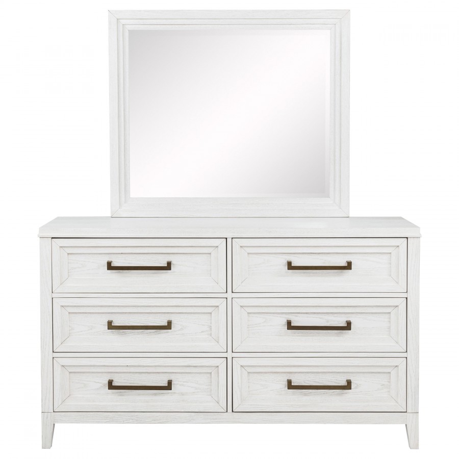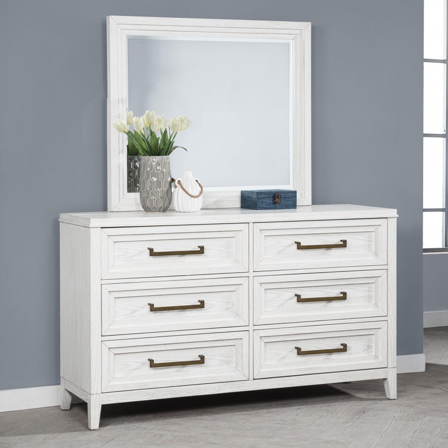 Introduce fresh style and inviting texture with a modern six-drawer dresser and framed mirror. It shows off a distressed white finish over wood grain texture, offering an inviting look and feel in your living room. Each drawer front features layered trim that creates depth and is augmented with a long bar pull in antique brass finish to create contrast. The mirror on top features a squares silhouette with layered trim that matches drawer fronts. Tapered legs complete the look and a tip over restraint is included to add safety in your bedroom.