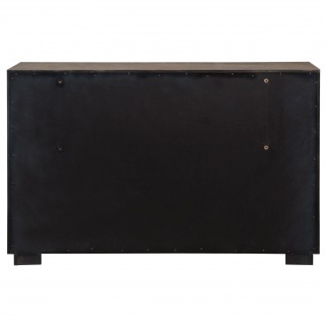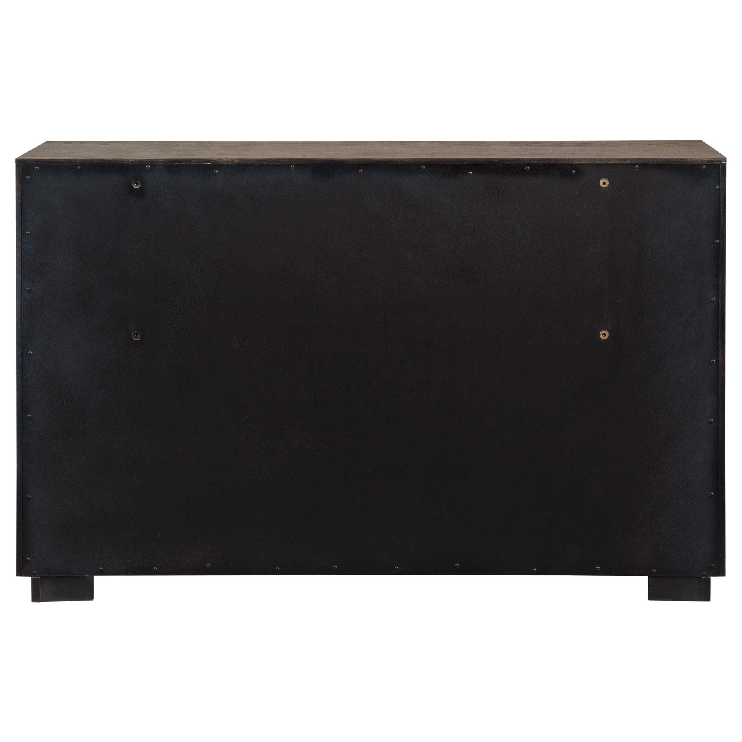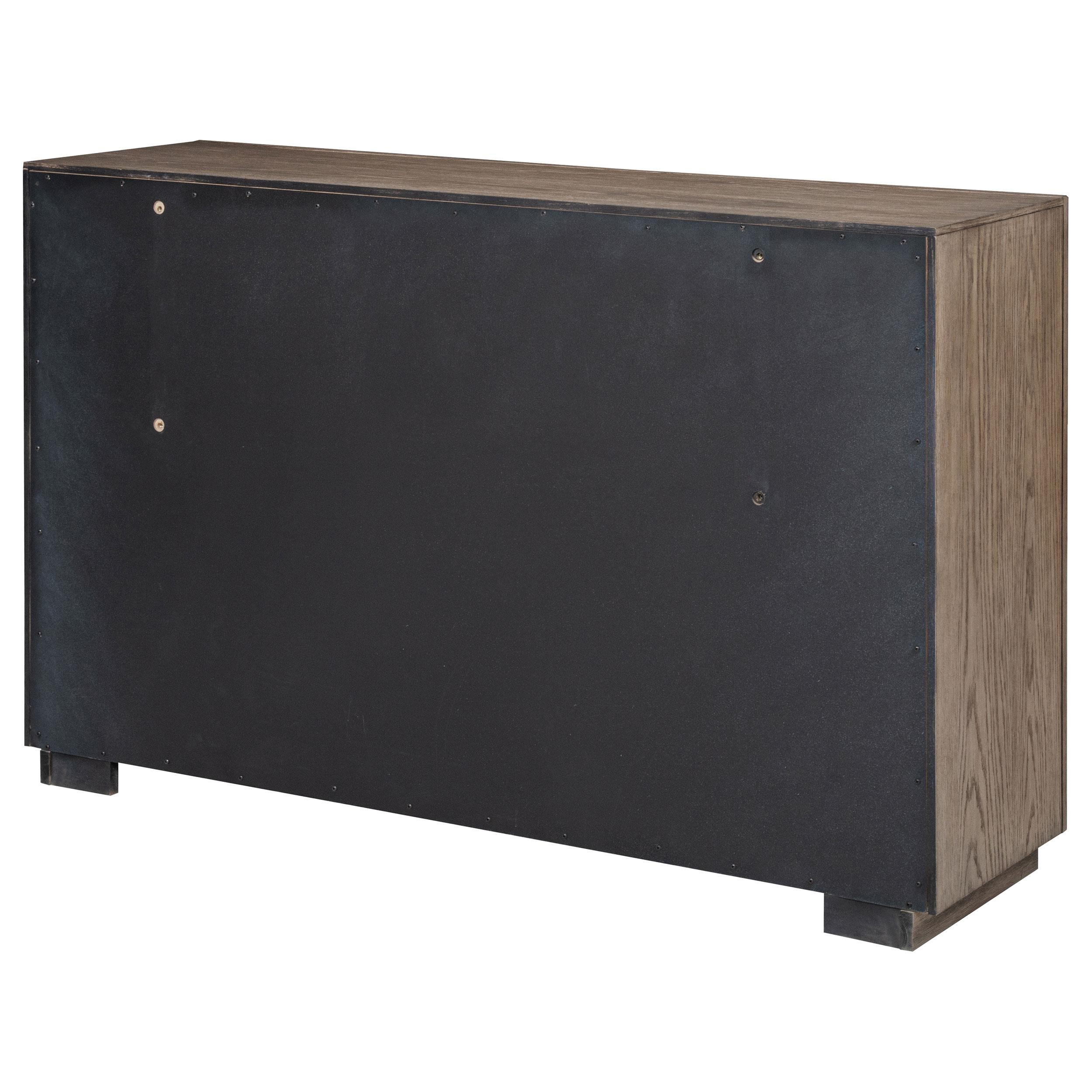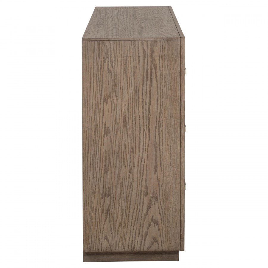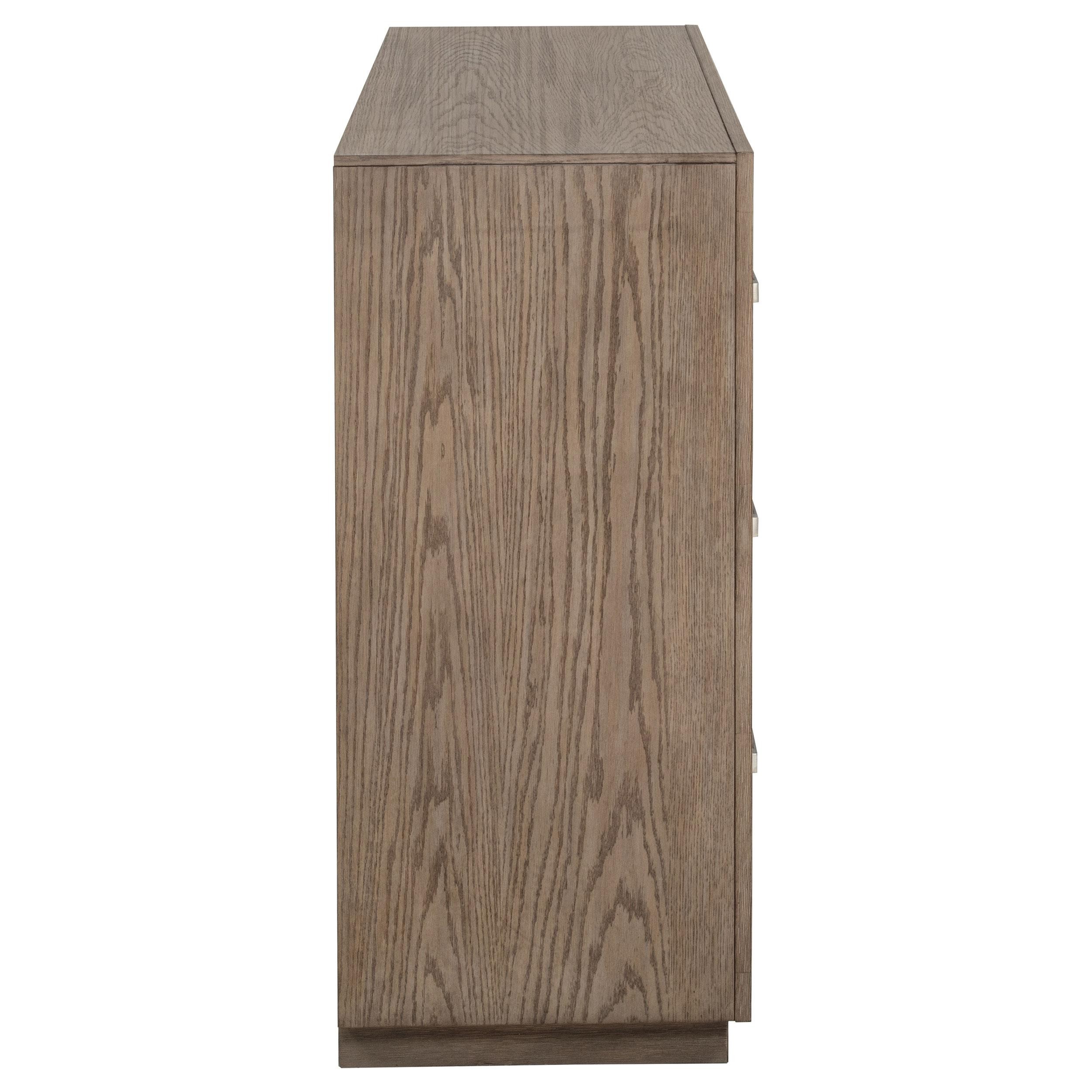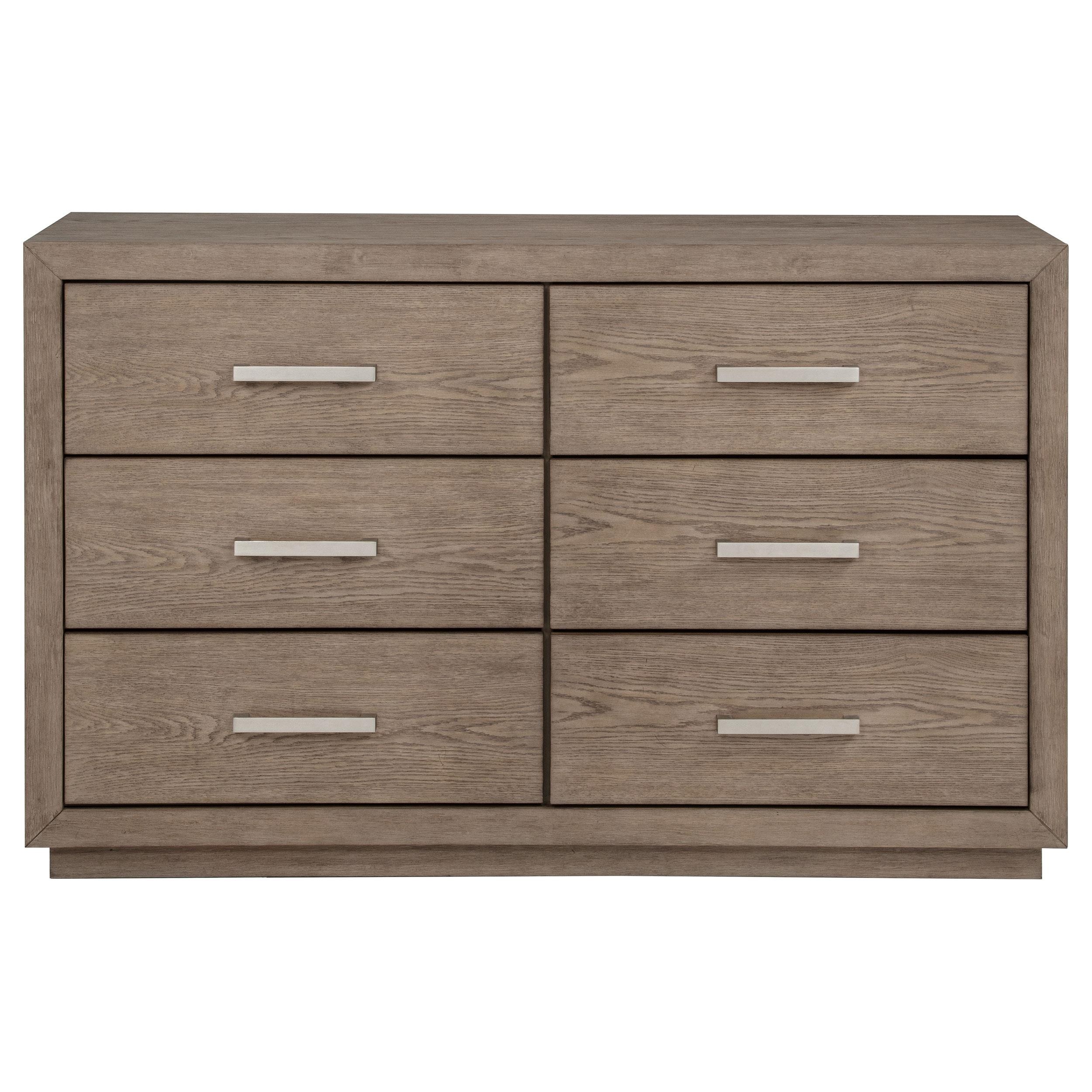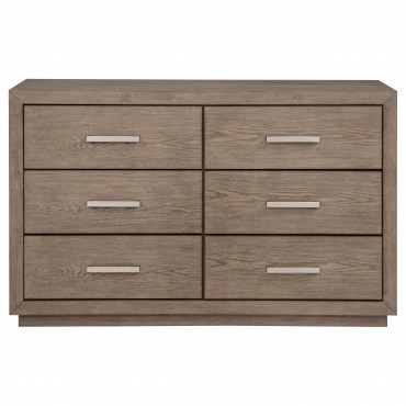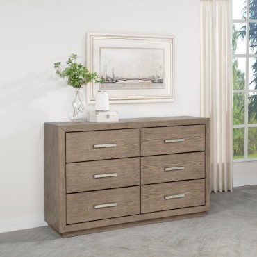 Enjoy the roomy storage and understated character of a modern six-drawer dresser. It's a fresh, understated design that showcases a wide top and recessed base that pair to deliver a timeless look. The dresser shows off wood grain details in a neutral barley brown finish, delivering stylish flair that complements in any setting. Each drawer is equally sized for easy storage and organization. Chrome finish bar pulls add a touch of contrast and textural appeal.