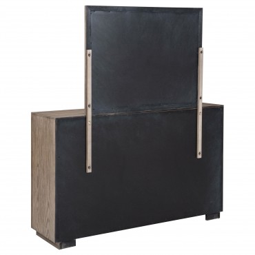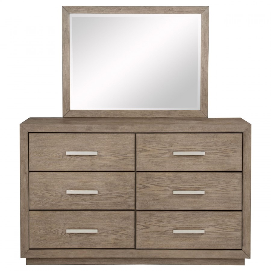 Put a timeless spin on bedroom decor with the refined flair of this modern six-drawer dresser. Designed for neutral appeal that blends into surrounding decor, it features a barley brown wood grain finish. Six drawer fronts are embellished with chrome finish bar pulls for a cohesive look with a touch of texture and depth. The dresser is augmented with a framed mirror on top, creating reflectivity in your bedroom and a spot for styling your daily looks. Add a jewelry box or valet and a bit of decor for a personal touch.
