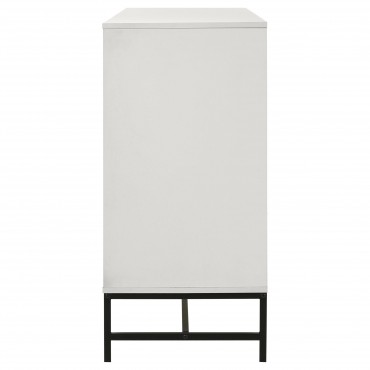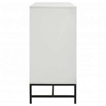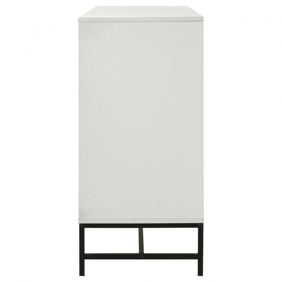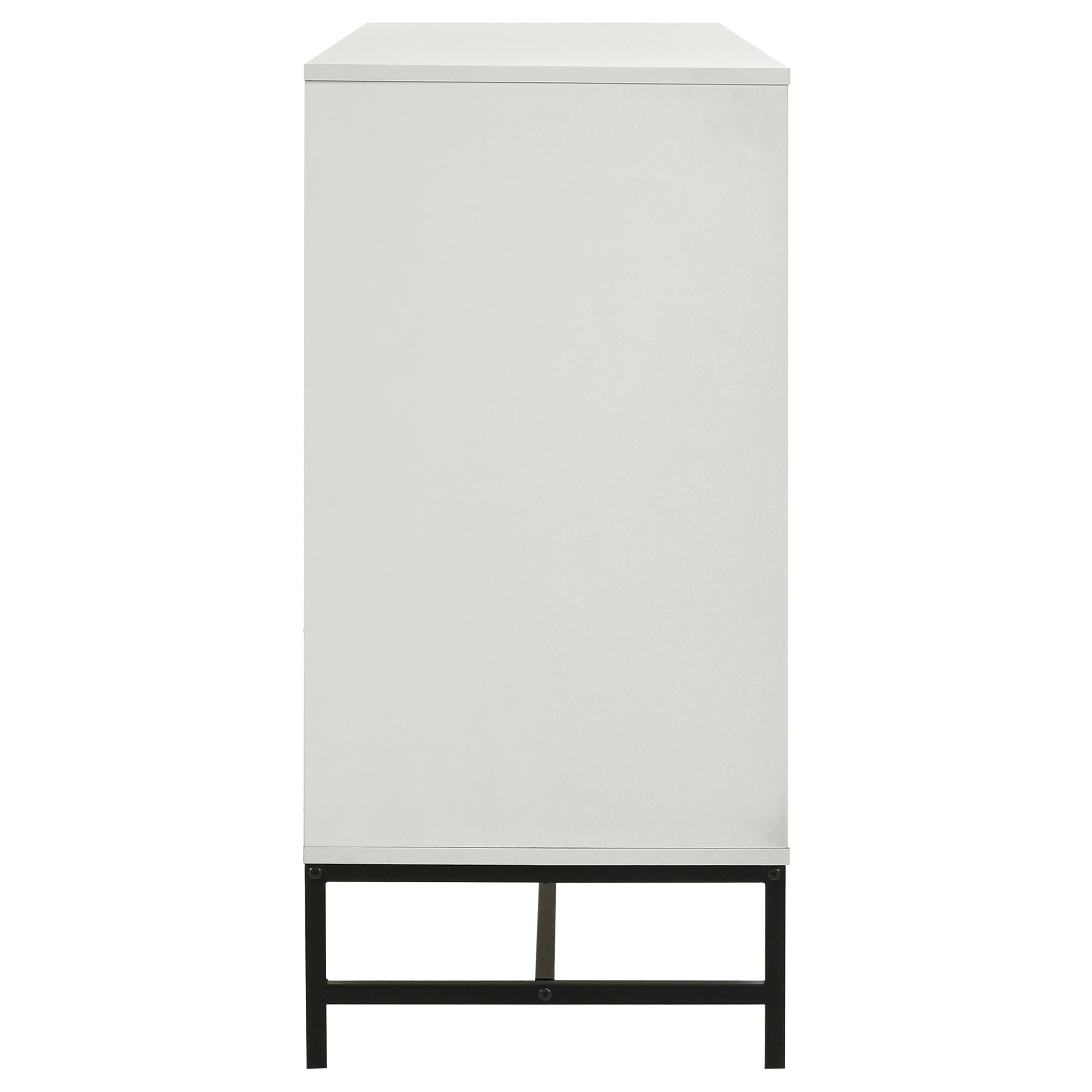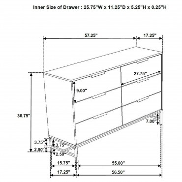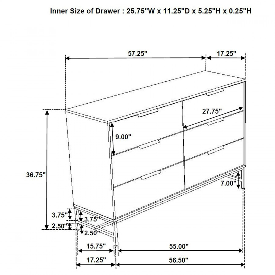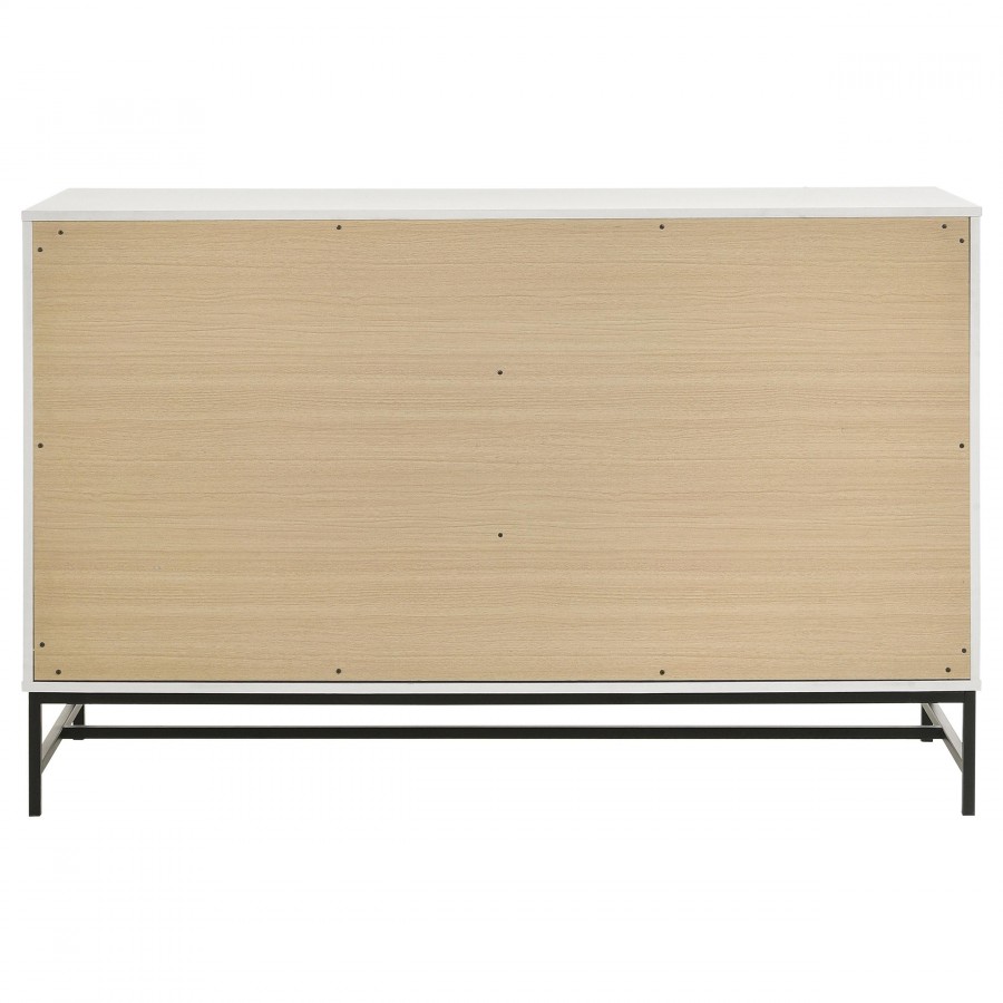 Fresh white brings bright, contemporary appeal to a modern six-drawer dresser. Perfect for a refined or casual bedroom space, it features a melamine finish that's durable and resistant to damage, great everywhere from master suite to a kid's bedroom. Each drawer features a long black finish bar pull that adds contrast. A matching black metal base elevates the dresser and creates an airy finishing touch. Use the top for decor that adds a personal touch to your bedroom.