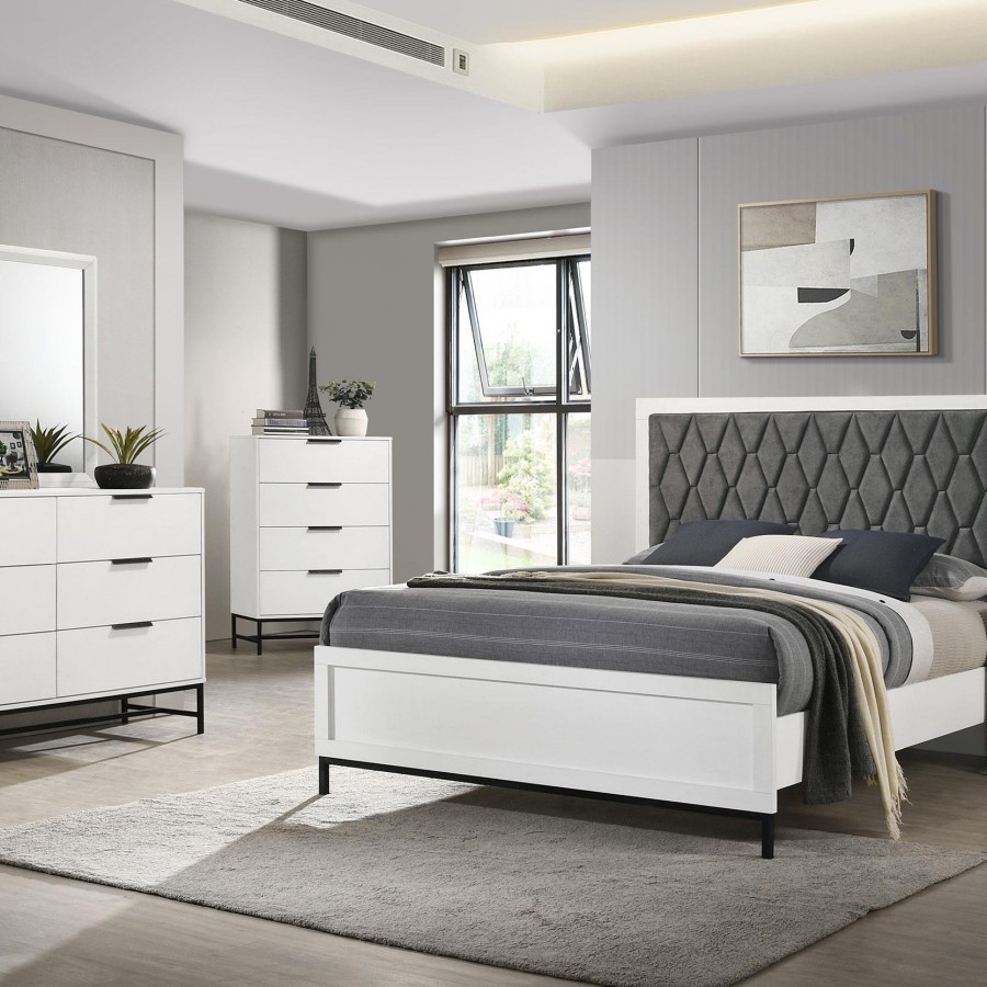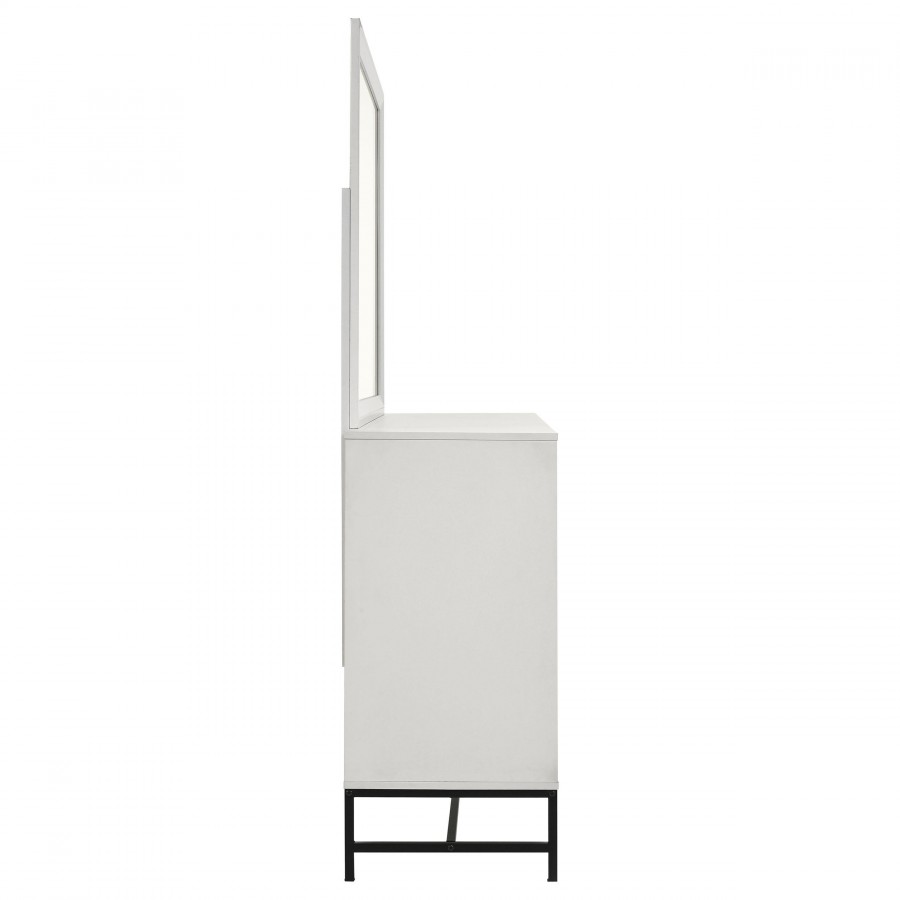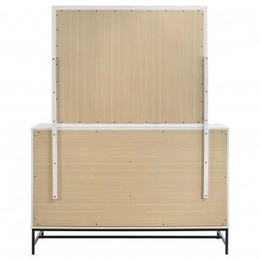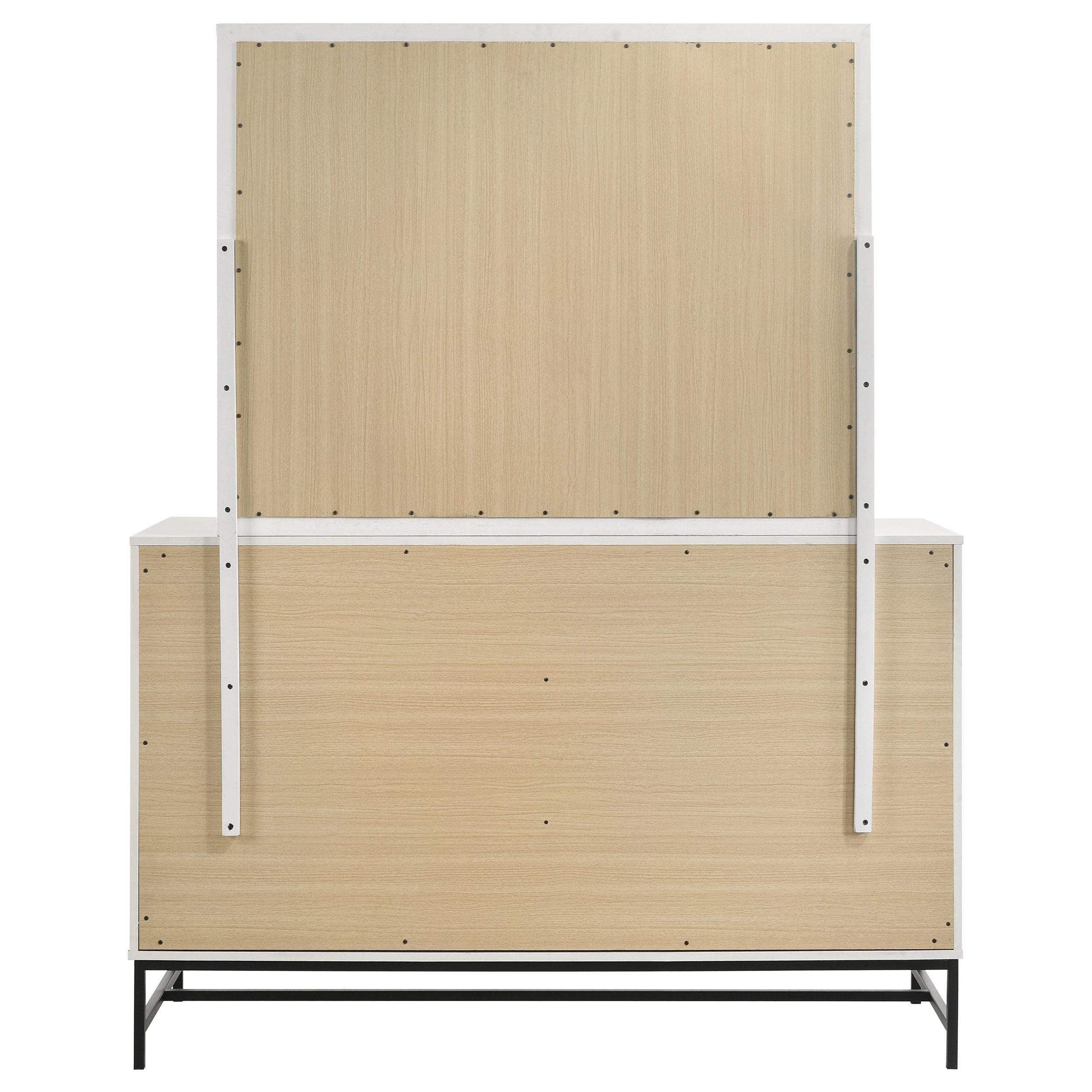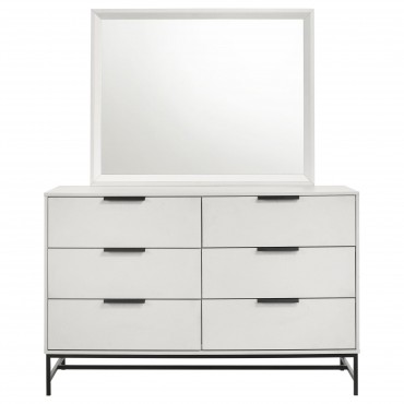 Enjoy the bright white finish featured on this modern dresser and mirror set. Complete with six drawers for easy storage, the dresser includes a framed mirror on top, perfect for getting ready in the morning and adding brightness to your bedroom. The dresser features a white melamine finish, offering excellent durability and resistance to minor scratches and other damage. It's complete with black finish hardware that includes bar pulls for each drawer and a decorative base that provides airy lift in your inviting space. Add photos or a jewelry box for a personal touch.