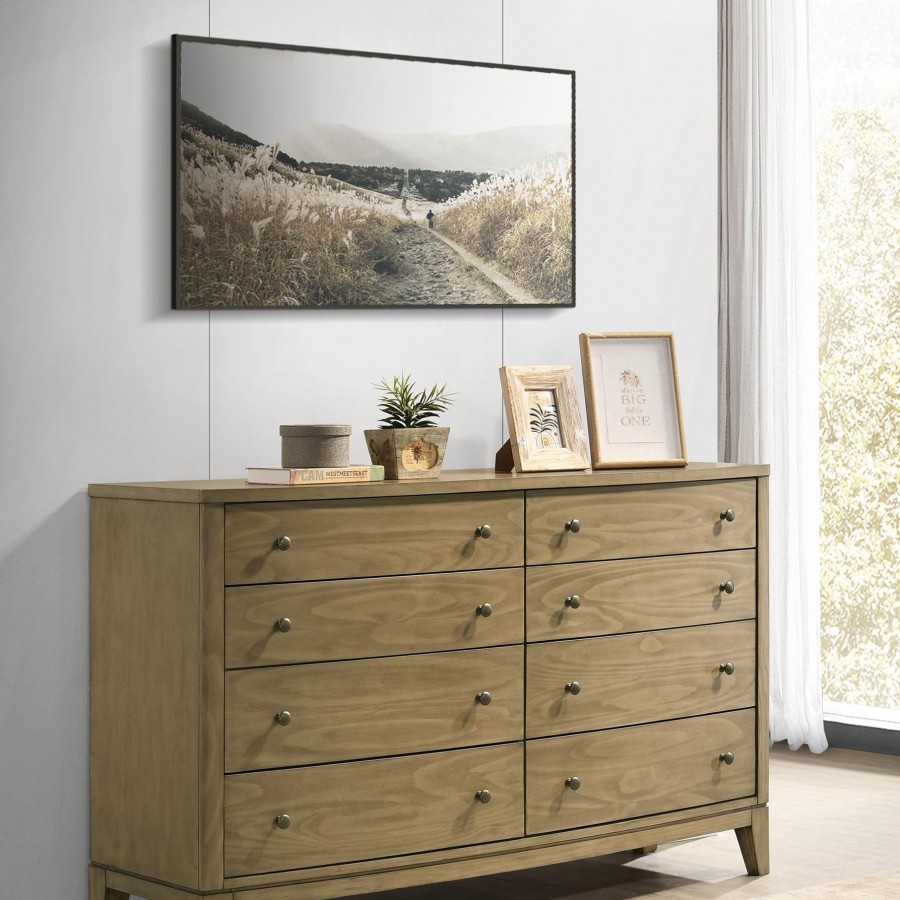 Organize your bedroom with this spacious 8-drawer dresser, offering both beauty and practicality. The dresser showcases a natural pine finish that highlights its solid pine wood tops and drawer fronts, giving it a refined yet cozy feel. Each drawer is equipped with 45mm thick glides, ensuring smooth operation, and features solid wood boxes with felt-lined tops for added luxury. Its softly curved fronts and antique nickel hardware complete the dresser's sophisticated look. This dresser is an ideal choice for those seeking style, durability, and ample storage.