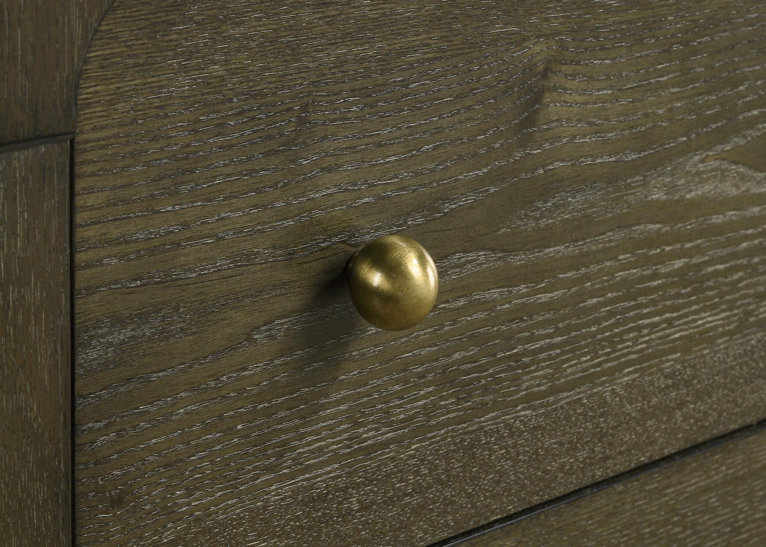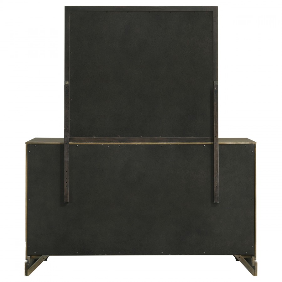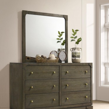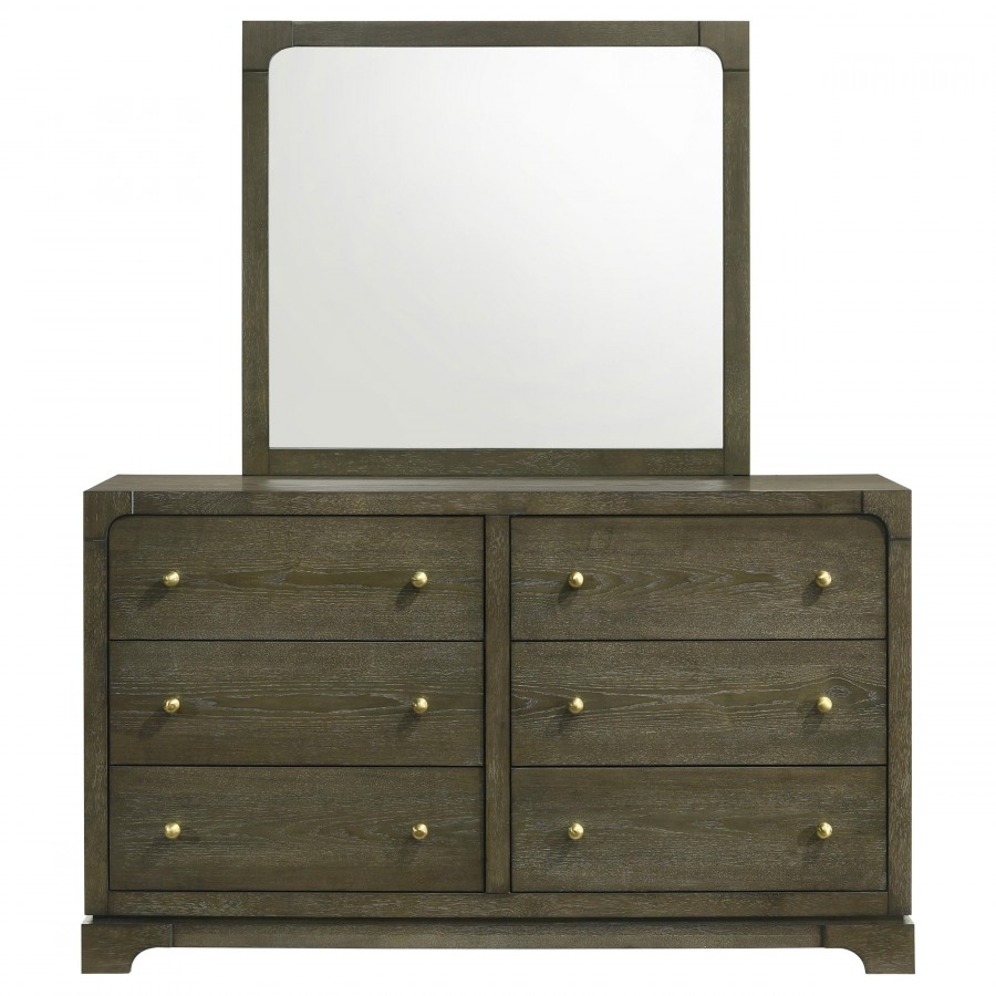 Elevate your bedroom with the sophisticated charm of this dresser and mirror set, designed with a transitional flair that features rounded corners and trending details. The dresser, finished in dark cocoa with brass knobs, offers a spacious storage solution with a touch of elegance. Crafted from solid hardwood, ash veneer, and MDF, it includes felt-lined top drawers and English dovetail joinery for durability and smooth operation. The mirror, perfectly complementing the dresser, adds a refined touch to your space. Together, they create a harmonious and stylish look, making your bedroom a serene retreat.